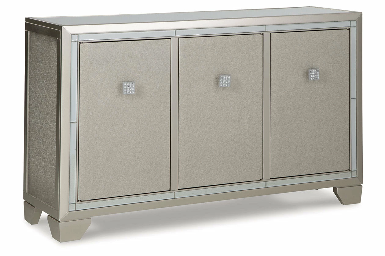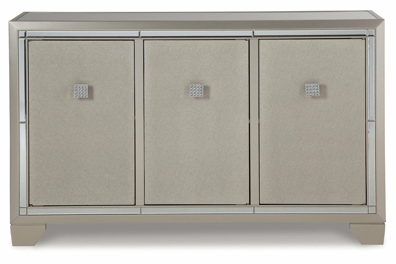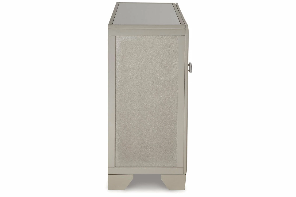 Reflect your love for contemporary style with this accent cabinet. It features a mirrored top and beveled mirror accents, adding both light and a touch of glam to your space. Decorated with faux crystal and chrome-tone pulls, the textured silvertone door fronts open to reveal adjustable shelving to meet all your storage needs.