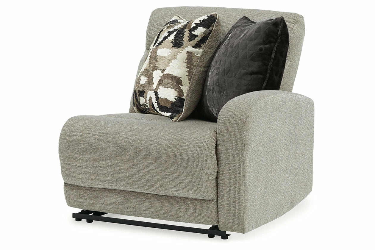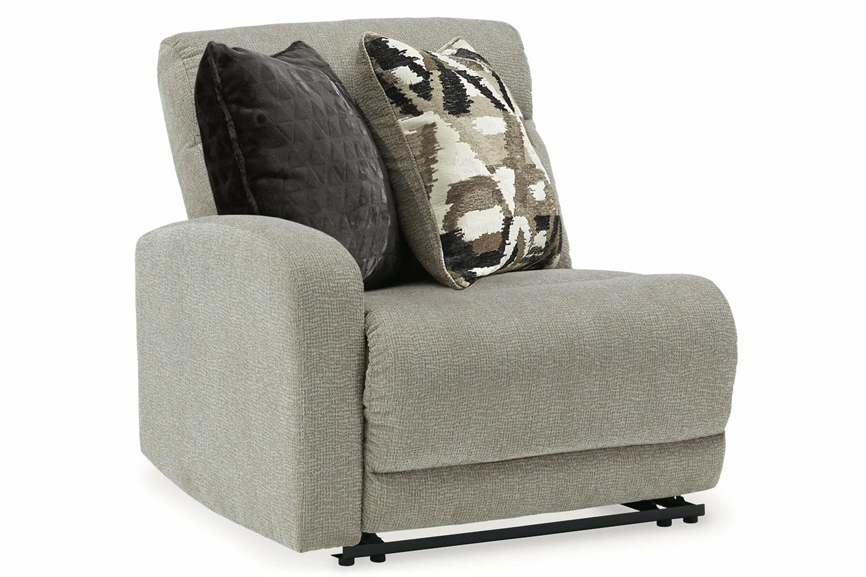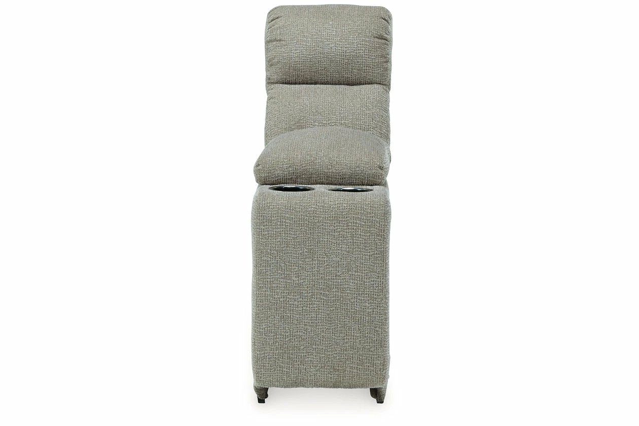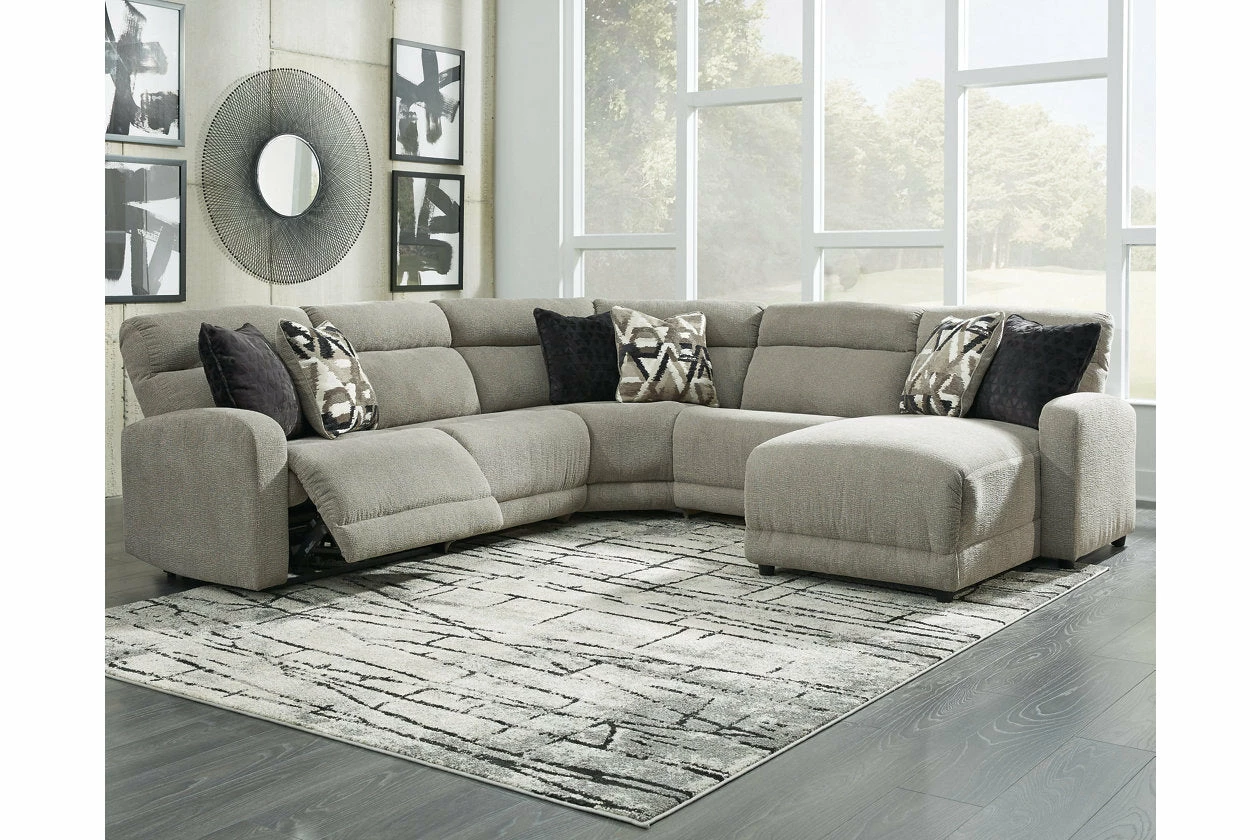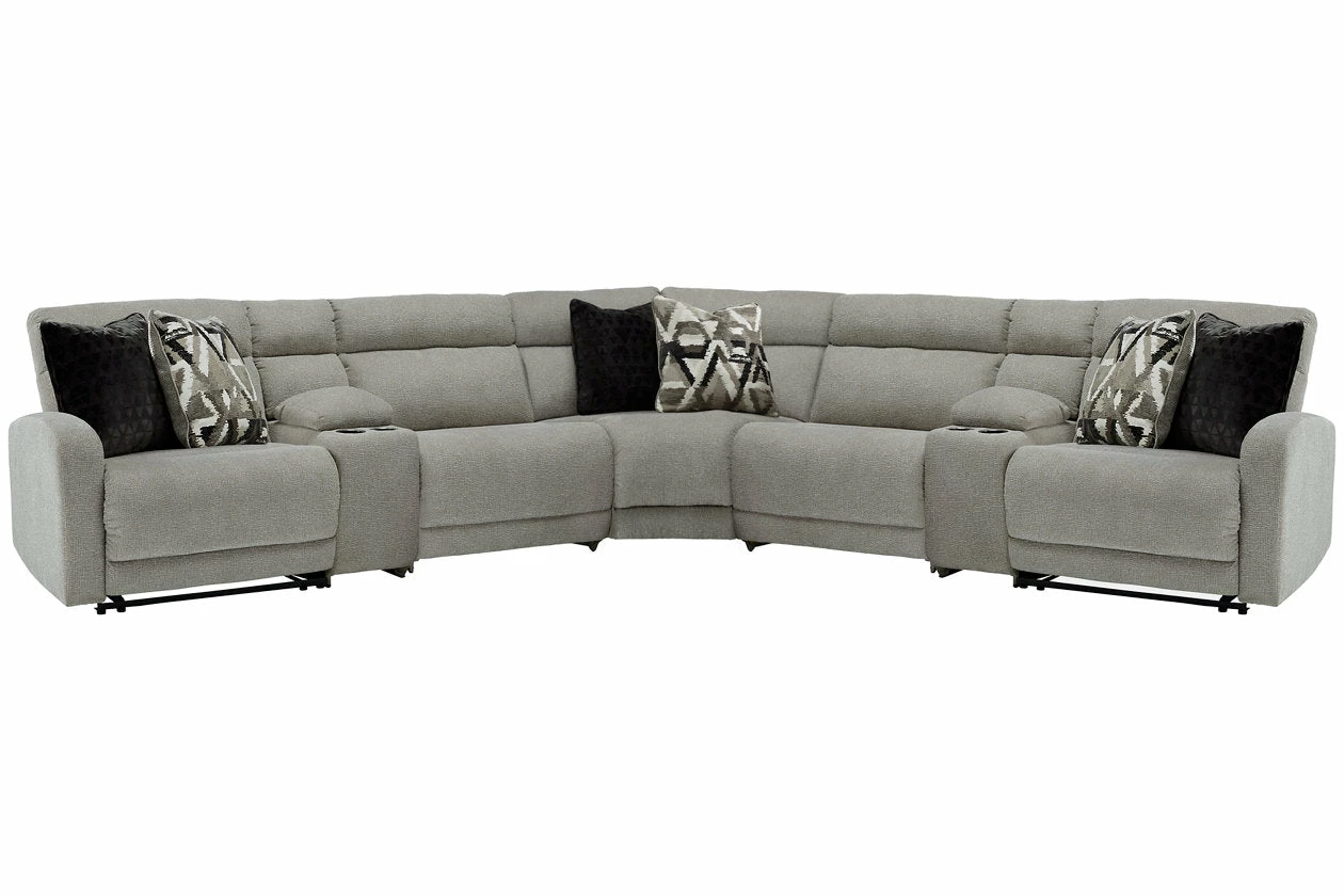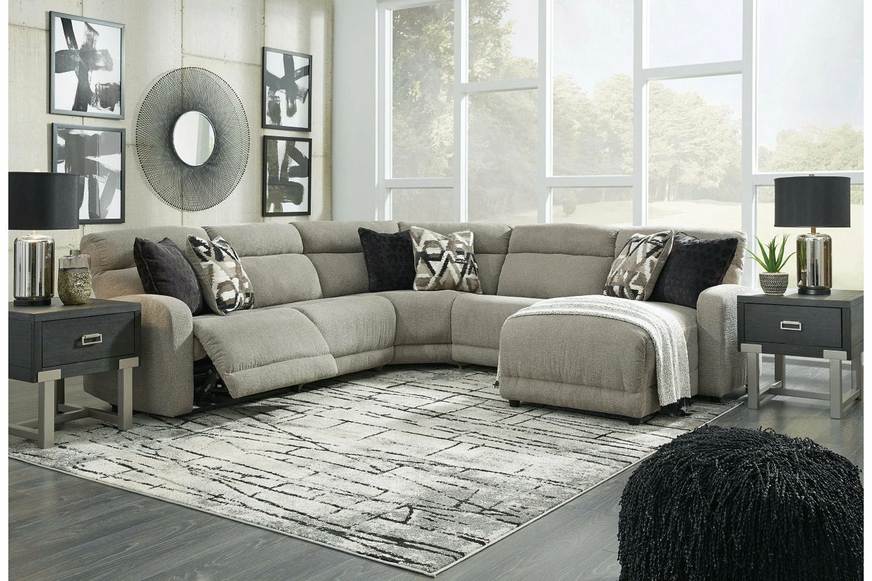 Delightfully modern. Exceptionally comfortable. When it comes to modular furniture with easy-elegant appeal, it’s hard to beat this power reclining sectional. Wrapped in a decadently plush stone-tone fabric for neutral versatility, this chic sectional is dressed to impress with a clean-lined divided back, curved track arms and a low-profile back for a relaxed, contemporary aesthetic.