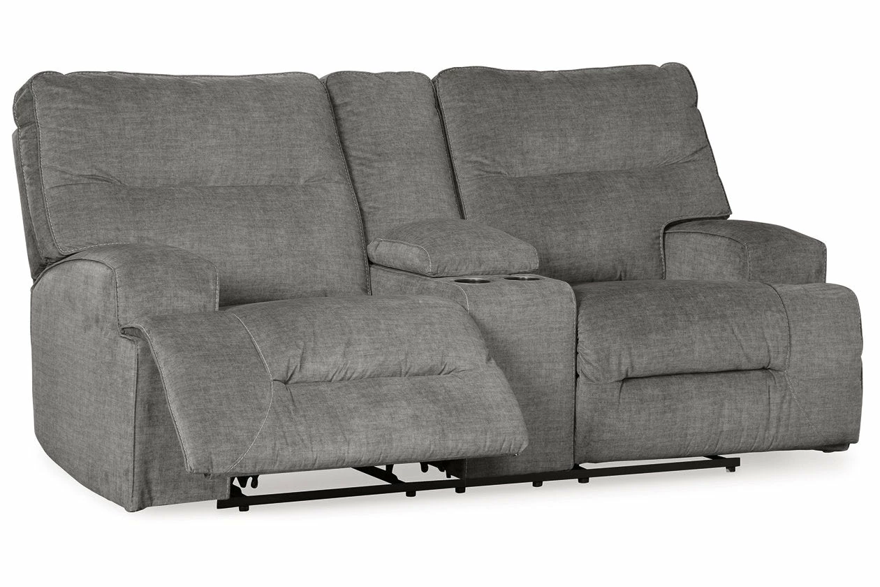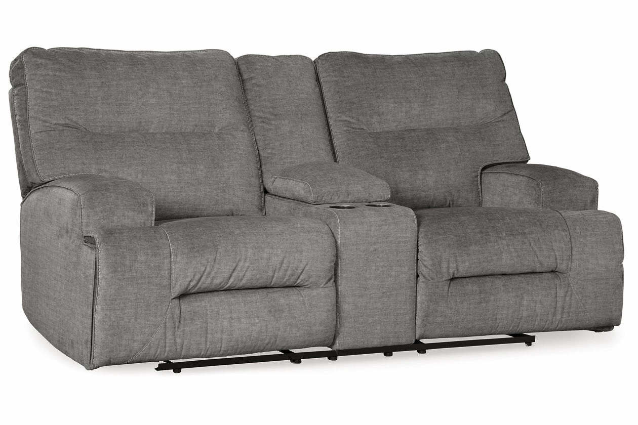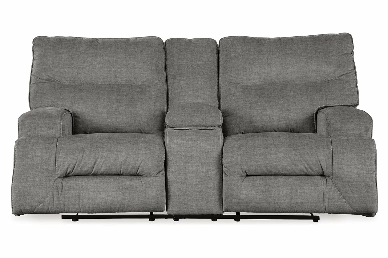 This reclining loveseat with console makes it hip to be square. Brilliantly boxy profile and wide track arms infuse a highly contemporary look you don’t often find in reclining furniture. Rest assured, the trendy charcoal-tone upholstery is sumptuously soft—and made all the more enticing with deep channel tufting for clean-lined flair. Dual cup holders and storage in the center console are a mighty handy touch.