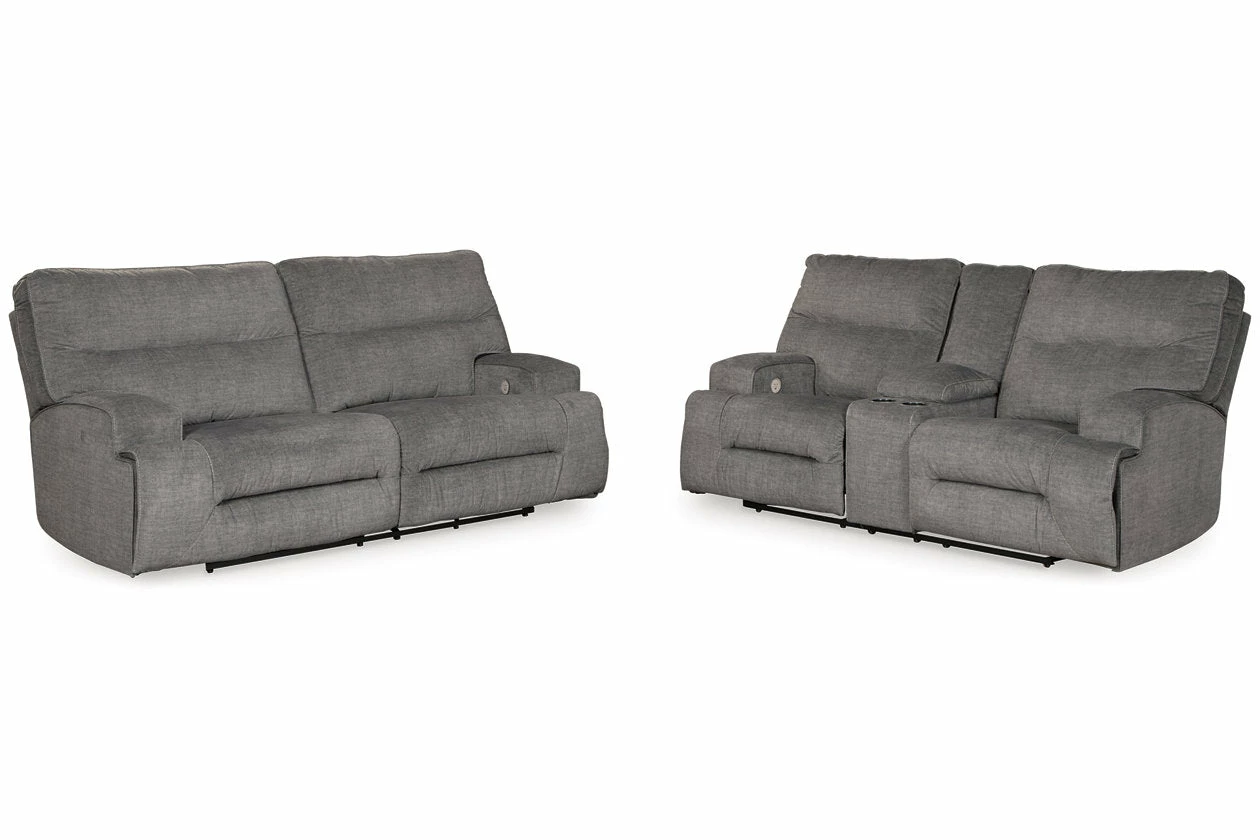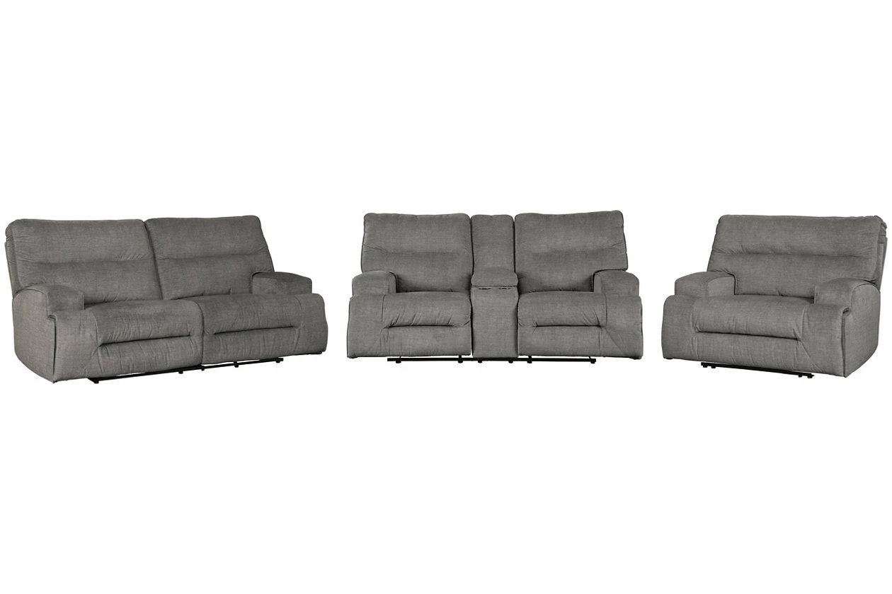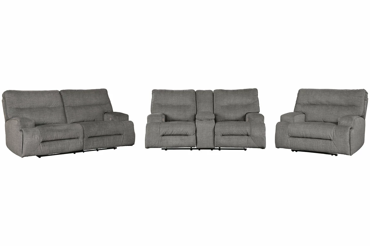 This reclining power sofa, reclining power loveseat and wide seat recliner set makes it hip to be square. Brilliantly boxy profile and wide track arms infuse a highly contemporary look you don’t often find in reclining furniture. Rest assured, the trendy charcoal-tone upholstery is sumptuously soft—and made all the more enticing with deep channel tufting for clean-lined flair. Along with dual cup holders and handy storage in the center console of the loveseat, you’ll enjoy a one-touch power control with USB port to keep devices charged while you unplug.