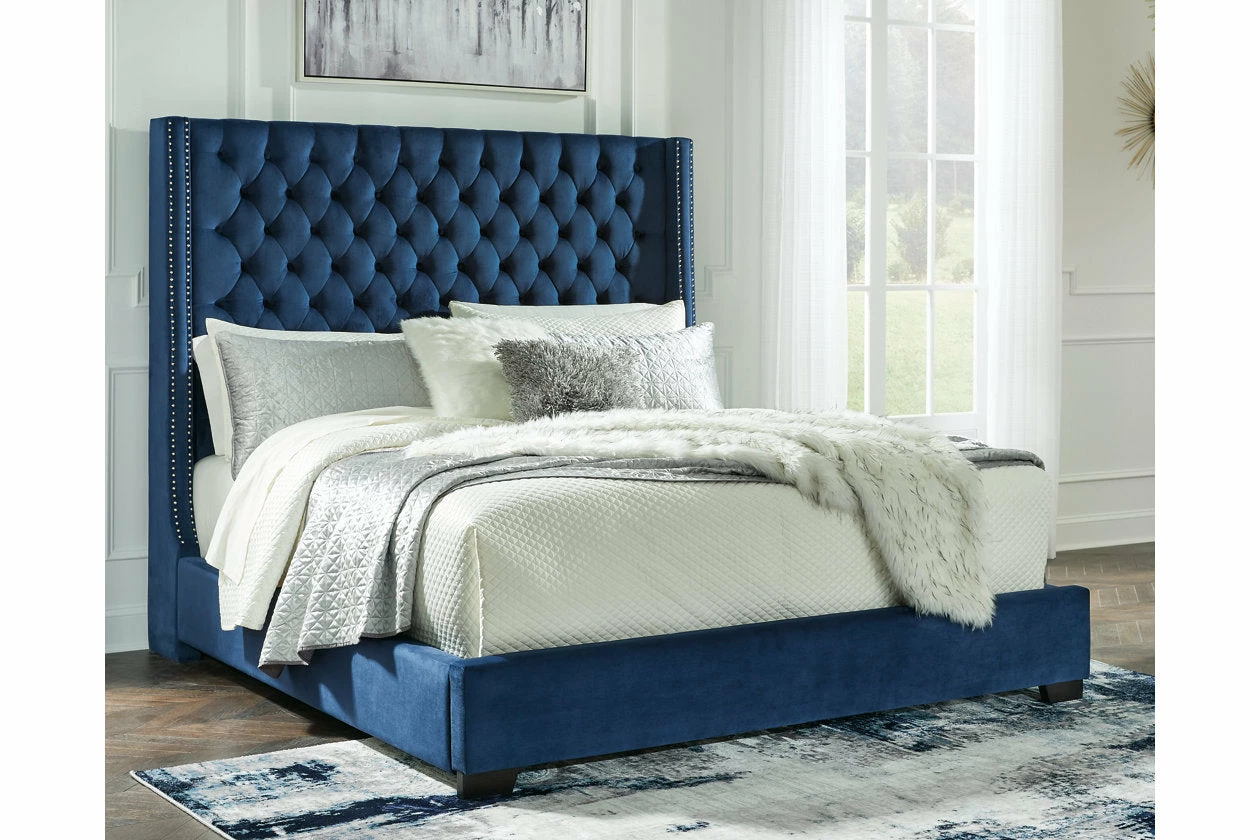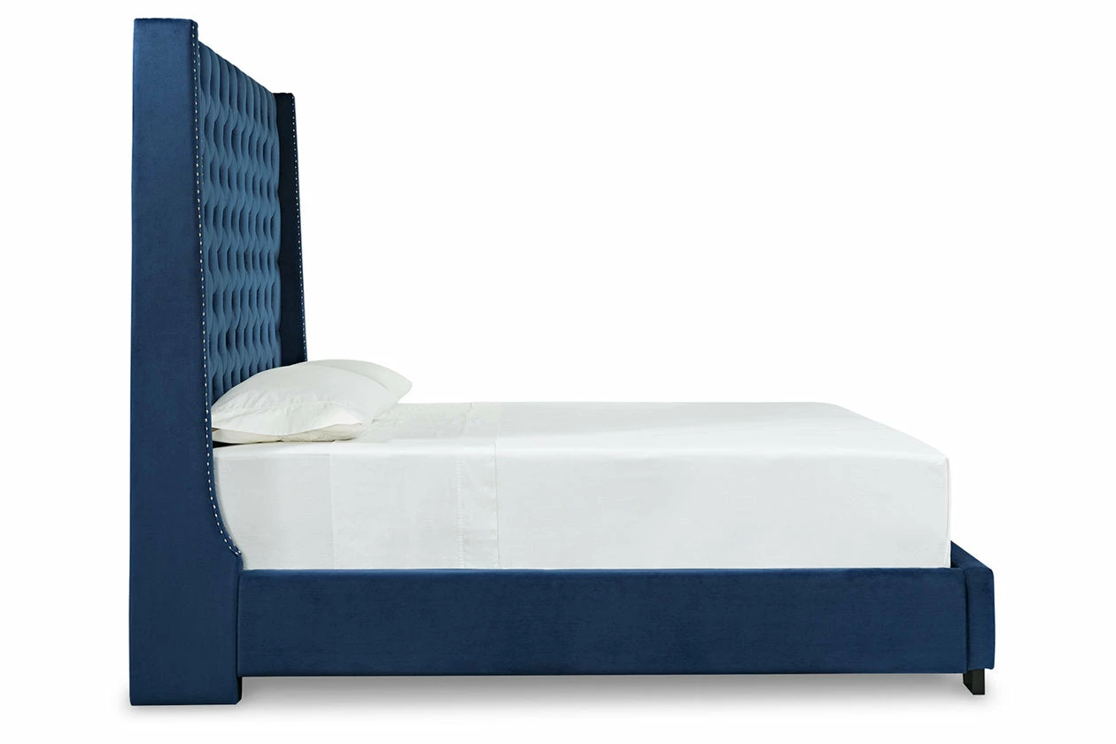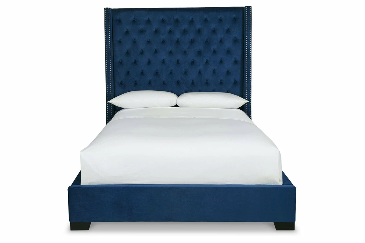 This California king upholstered bed allures with the glitz and glam befitting silver screen queens. Textured blue velvet upholstery with tufted details channels that upscale flair you’ve been dreaming of. The generously scaled headboard will have you feeling sheltered in comfort and luxury.