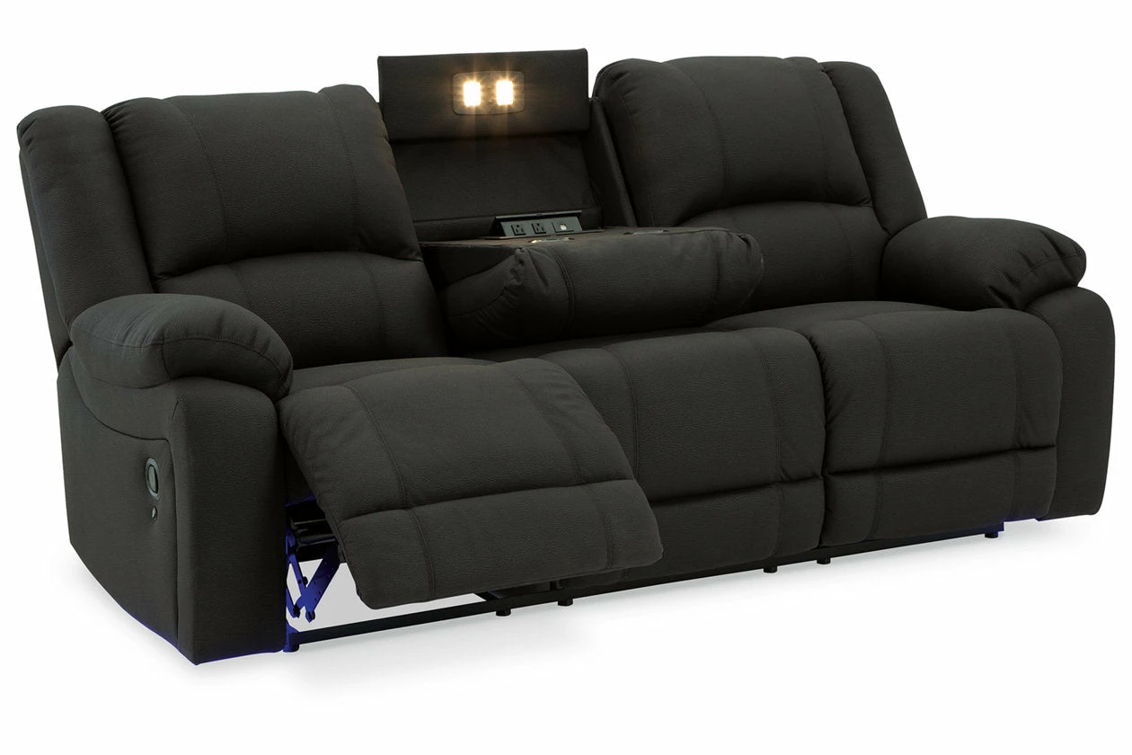 This reclining loveseat with console leaves a lasting impression. Chic black faux leather upholstery, pillow top armrests and thick bustle back cushions provide irresistible comfort. A center console with dual cup holders adds everyday convenience. And here’s the showstopper—ambient blue LED lighting on each arm base, to create a theater-style experience that’s perfect for a family space or home theater.