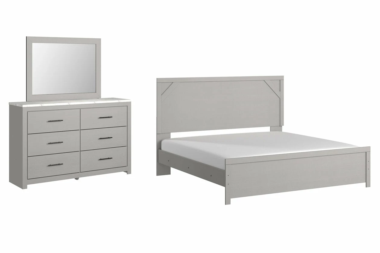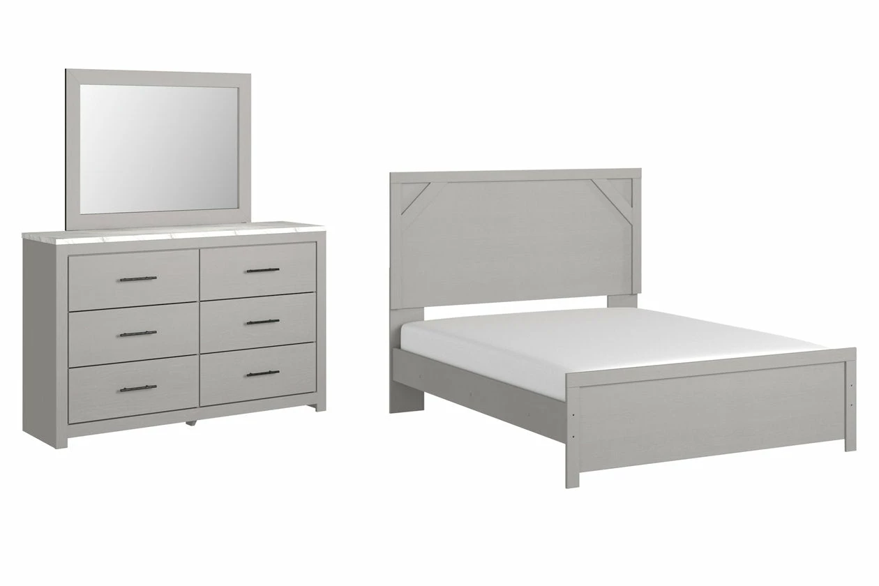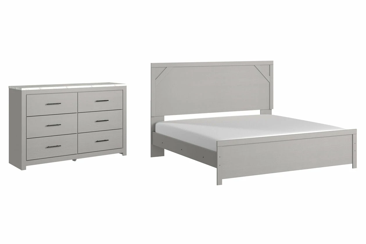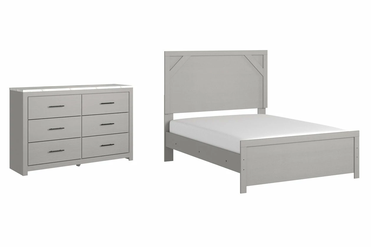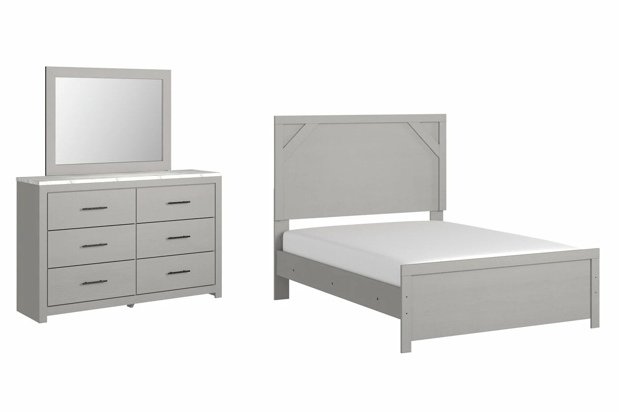 Cool, clean and casually modern. This bedroom set’s wispy dove gray finish sets the tone for your calming sanctuary. Framed elements and cross-brace accents add dimension and authenticity to the bed’s simply stunning profile. The dresser’s large linear pulls and smooth-gliding drawers neatly accommodate your wardrobe needs.