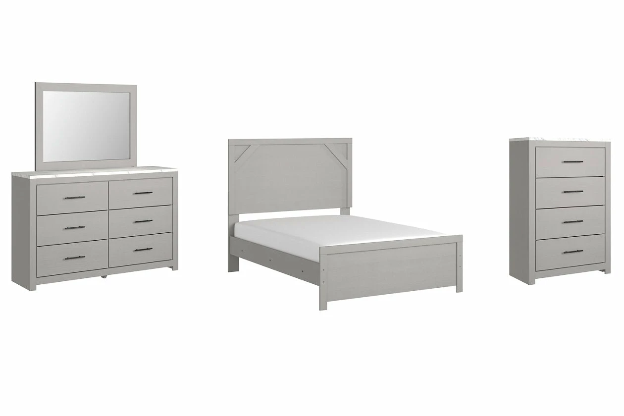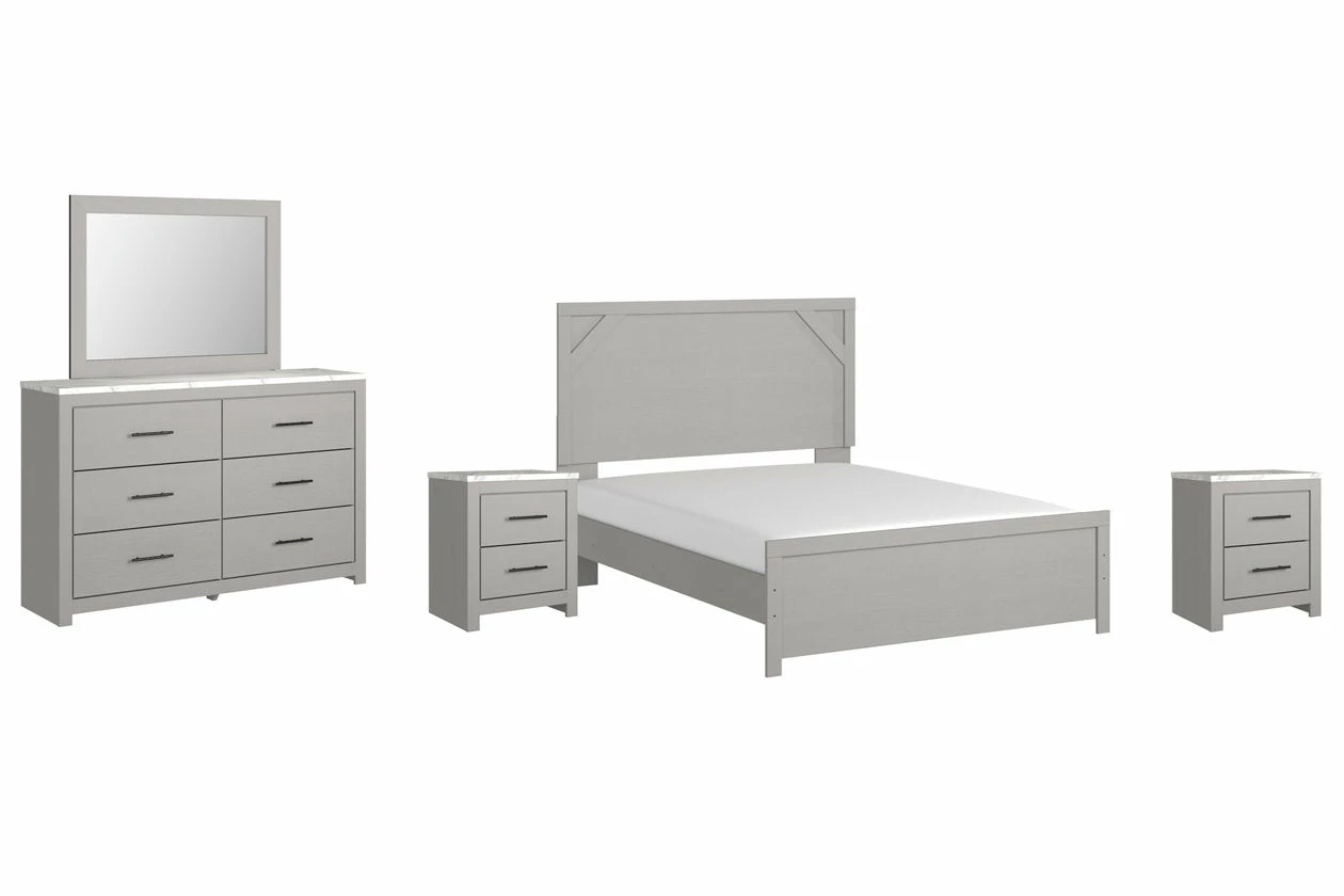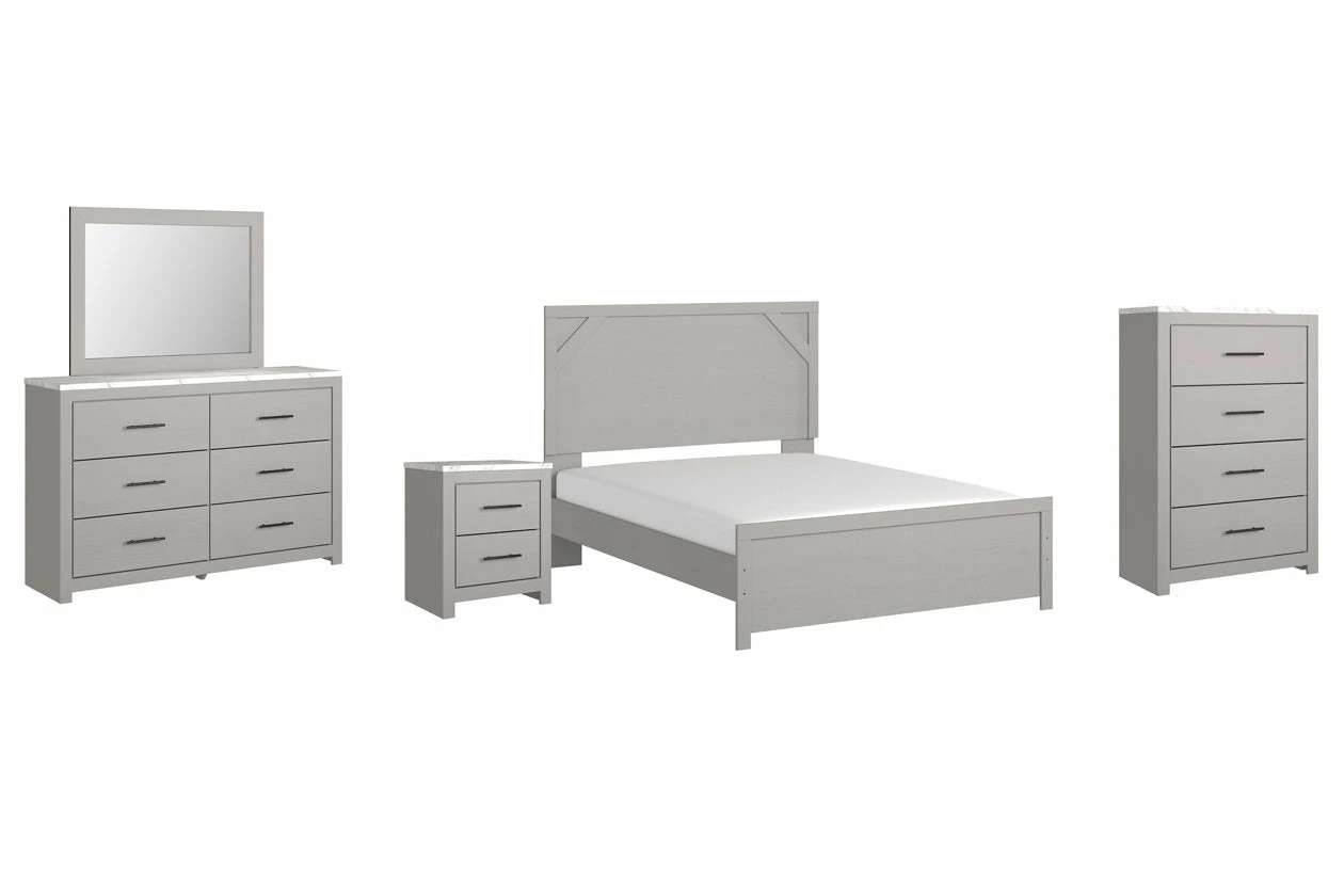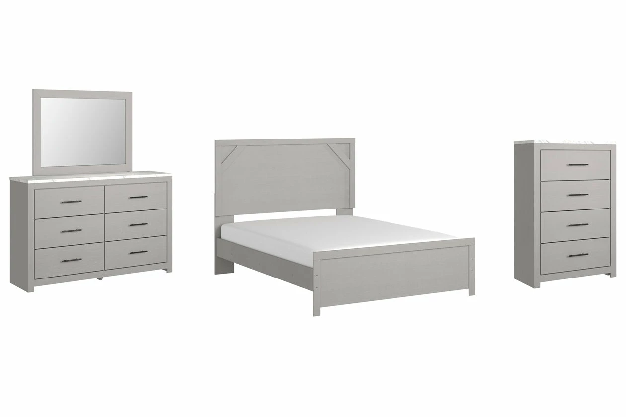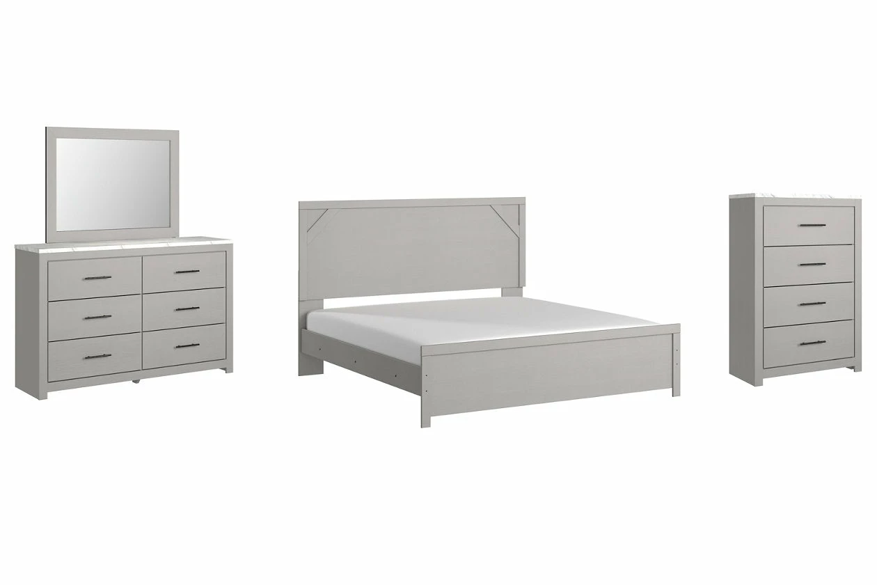 Cool, clean and casually modern. This bedroom set’s wispy dove gray finish sets the tone for your calming sanctuary. Framed elements and cross-brace accents add dimension and authenticity to the bed’s simply stunning profile. The dresser’s large linear pulls and smooth-gliding drawers neatly accommodate your wardrobe needs.