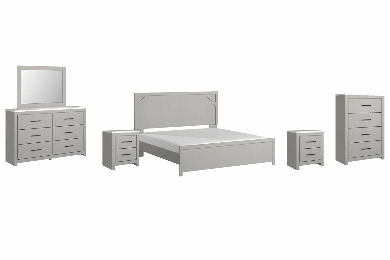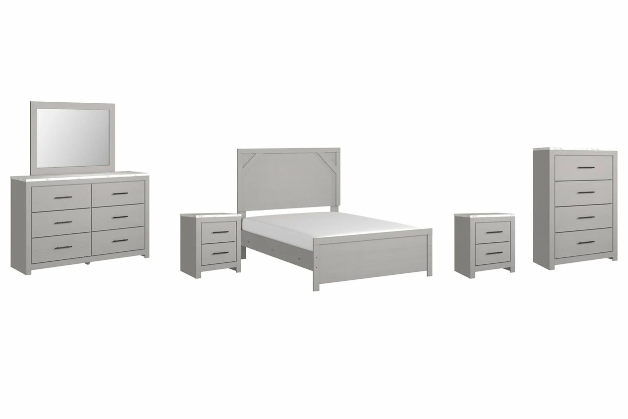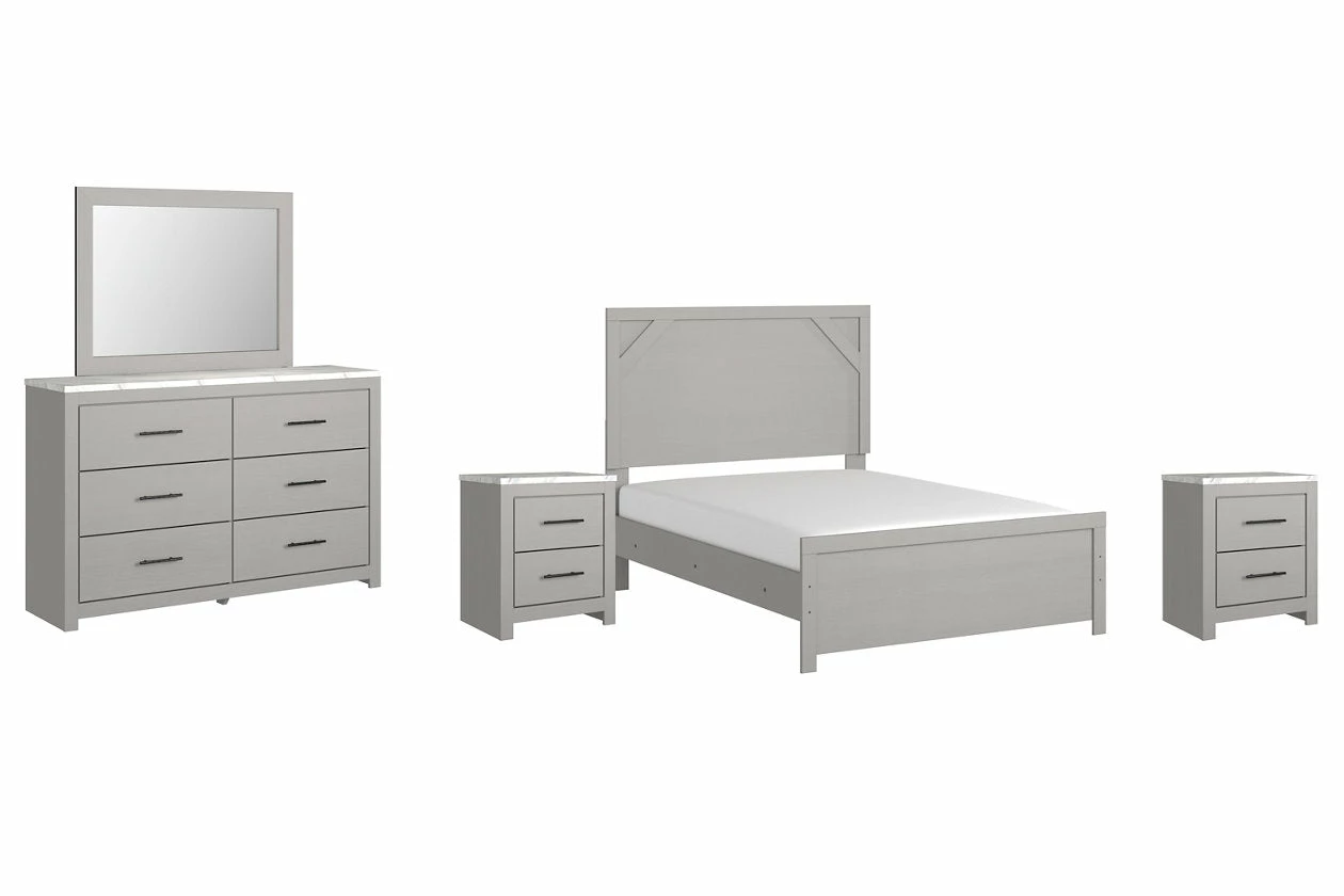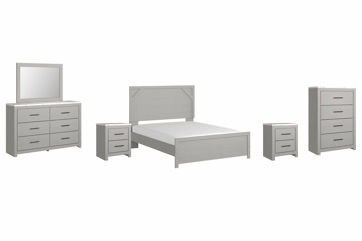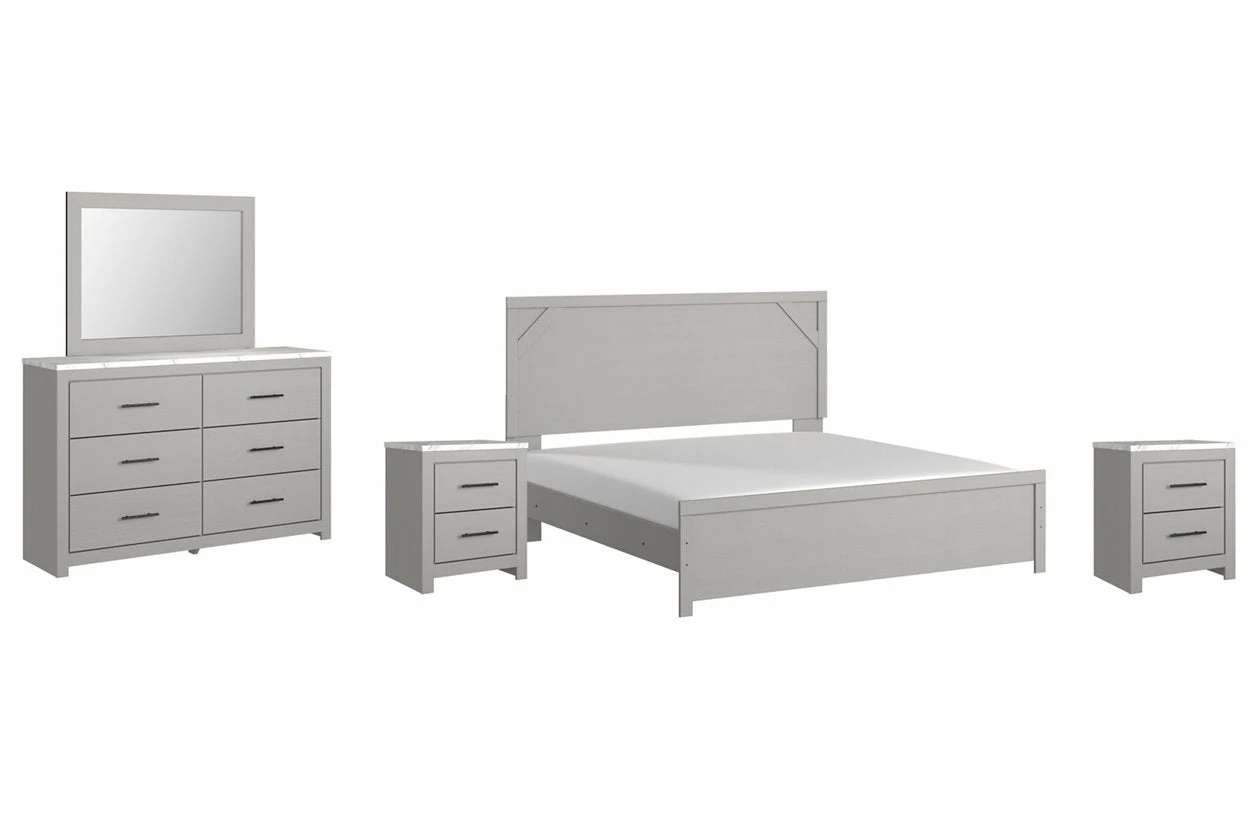Cool, clean and casually modern. This bedroom set’s wispy dove gray finish sets the tone for your calming sanctuary. Framed elements and cross-brace accents add dimension and authenticity to the bed’s simply stunning profile. The dresser’s large linear pulls and smooth-gliding drawers neatly accommodate your wardrobe needs.