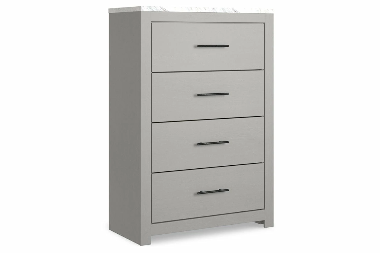 Cool, clean and casually modern. This chest’s wispy dove gray finish and faux Calcutta marble top set the tone for your calming sanctuary. Large linear pulls add dimension and authenticity. Four smooth-gliding drawers neatly accommodate your wardrobe needs.