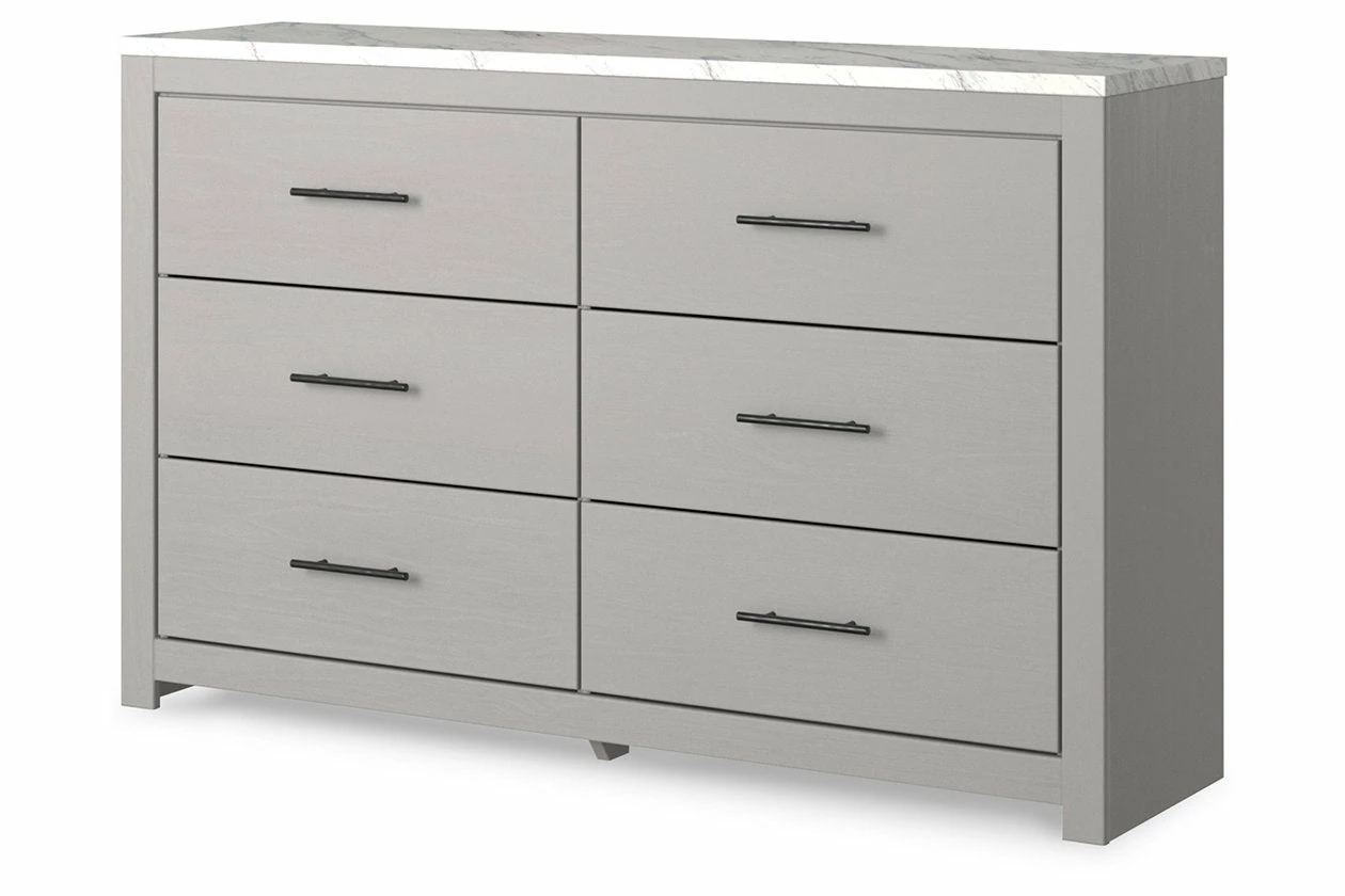 Cool, clean and casually modern. This dresser’s wispy dove gray finish and faux Calcutta marble top set the tone for your calming sanctuary. Large linear pulls add dimension and authenticity. Six smooth-gliding drawers neatly accommodate your wardrobe needs.