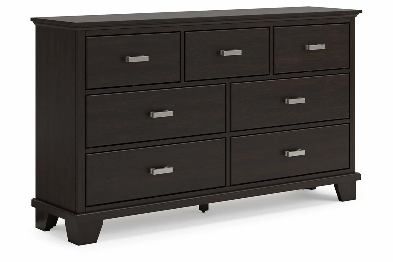 Feast your eyes on this richly versatile dresser. Its traditional-inspired dark brown finish effortlessly blends with contemporary bright nickel-tone pulls to create a stunning look that’s not too stuffy or too trendy. Spacious drawers offer plenty of storage for your wardrobe and spare bed linens.