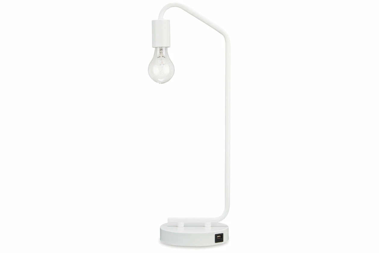 Brilliant in its minimalist form, this desk lamp suspends its exposed bulb in one sleek swoop. Constructed of metal, the compact, lightweight lamp is portable and features a single USB charging port. We see it glowing bedside, on a bookshelf or on either end of a credenza.