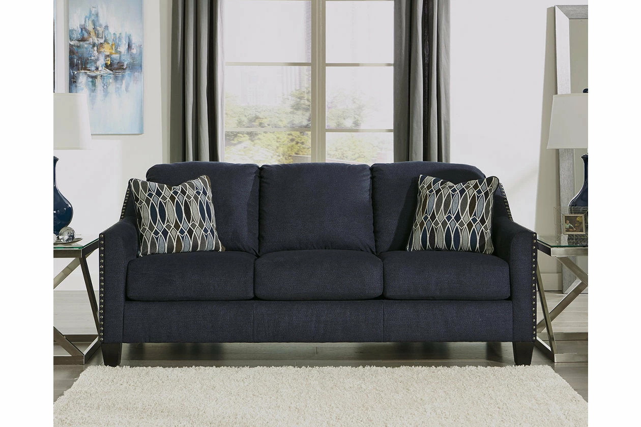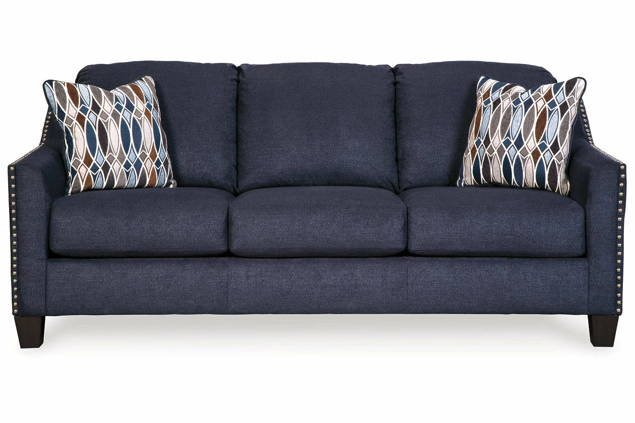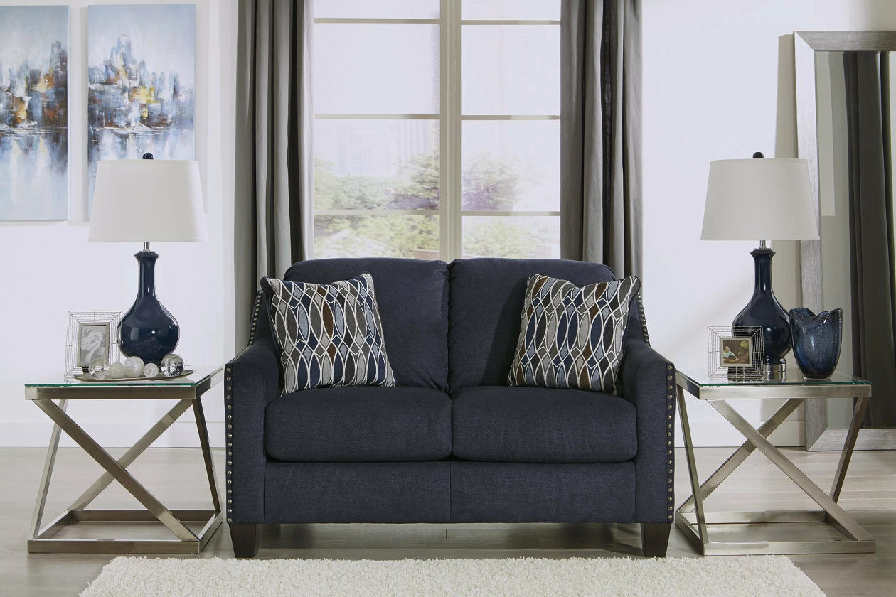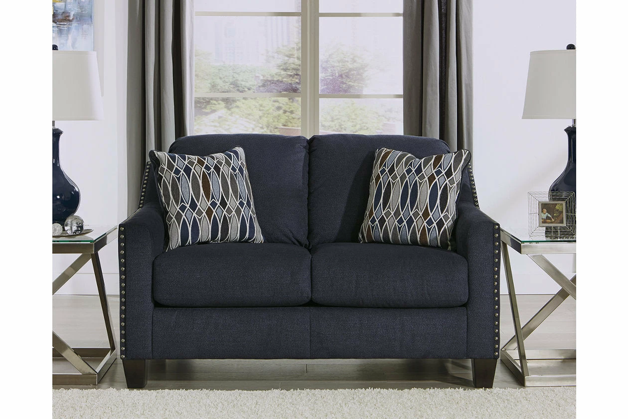 Upholstered in a striking midnight blue fabric with a soft brushed feel, this loveseat is undeniably handsome. Sloping arms are beautifully outlined with brushed nickel nailhead. Plush seating sets the scene for toss pillows immersed in a glasswork-inspired pattern design.