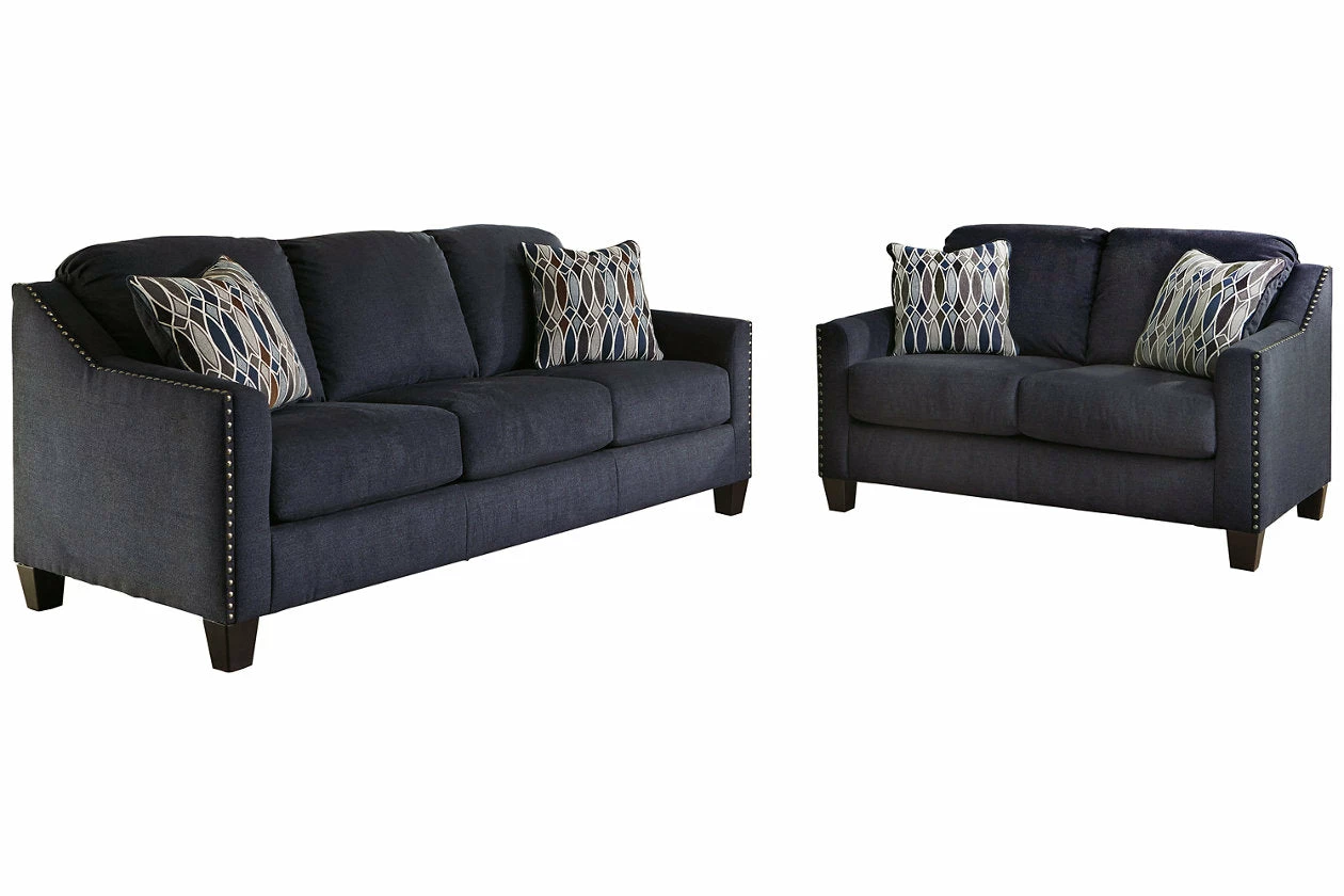 Upholstered in a striking midnight blue fabric with a soft brushed feel, this sofa and loveseat set is undeniably handsome. Sloping arms are beautifully outlined with brushed nickel nailhead. Plush seating sets the scene for toss pillows immersed in a glasswork-inspired pattern design.