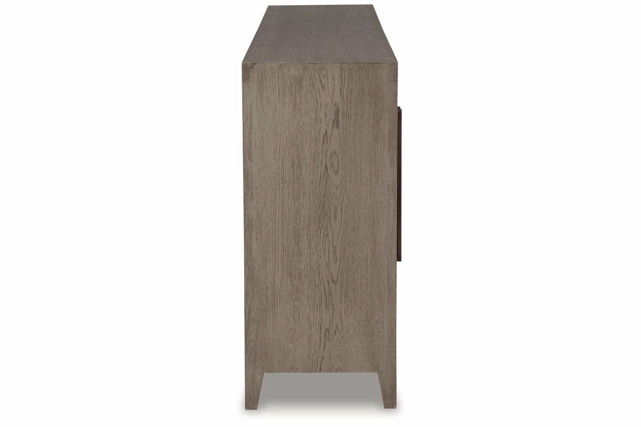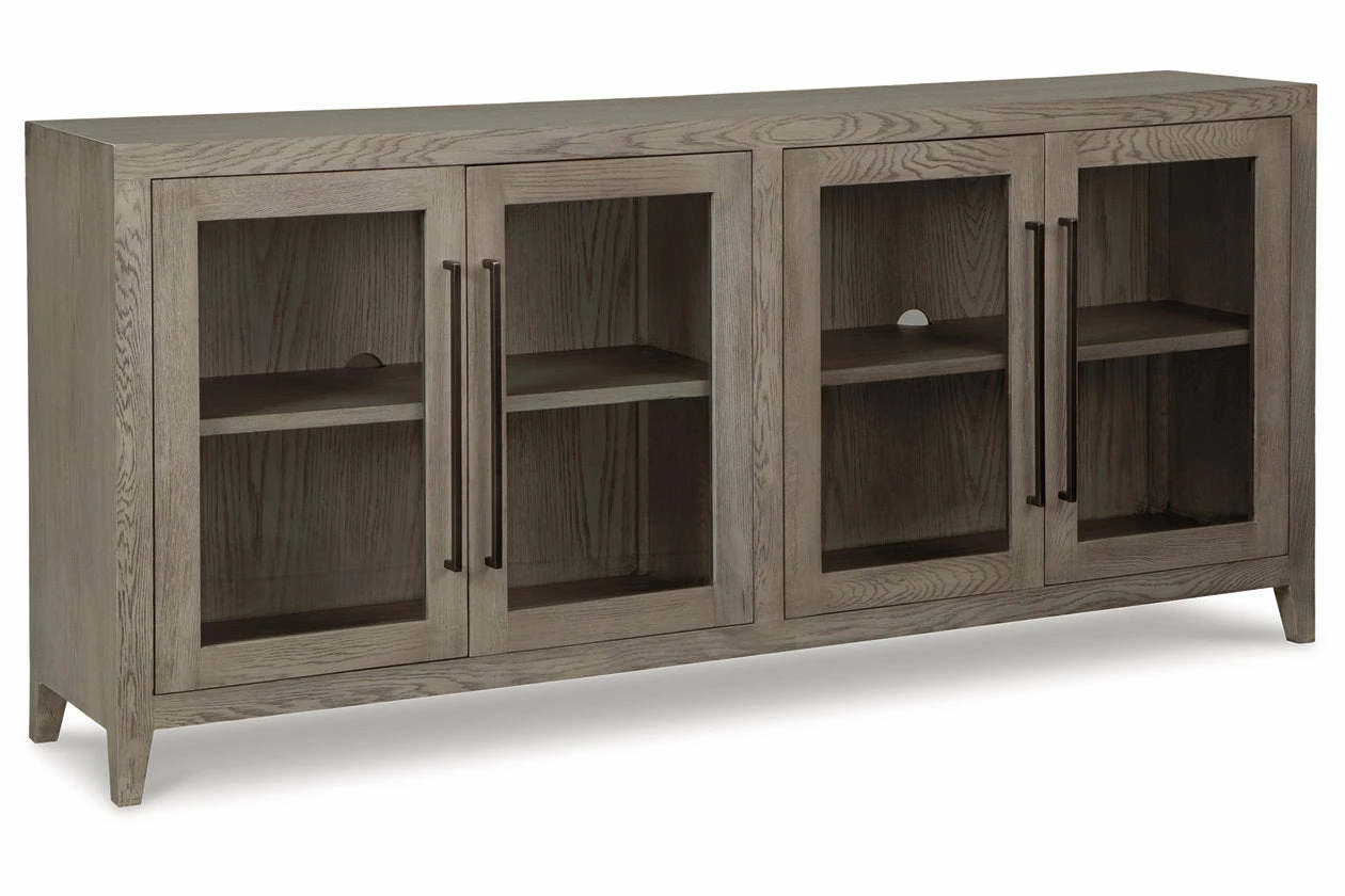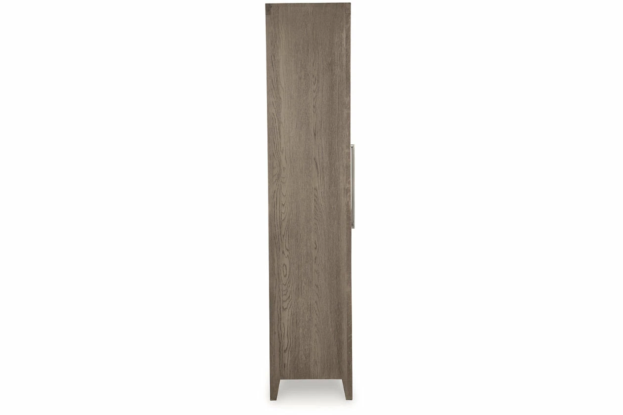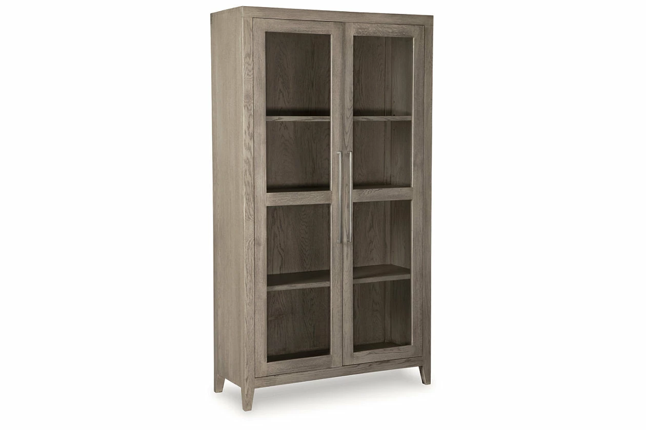 Earthy yet elegant. Simple yet so sophisticated. Like a work of modern art, this accent cabinet is open to interpretation. A great character piece for a dining room, entryway or living area, this glass-front storage cabinet simply wows with ultra-clean lines, light wire-brushed effects and a tasteful touch of pewter-tone sheen.