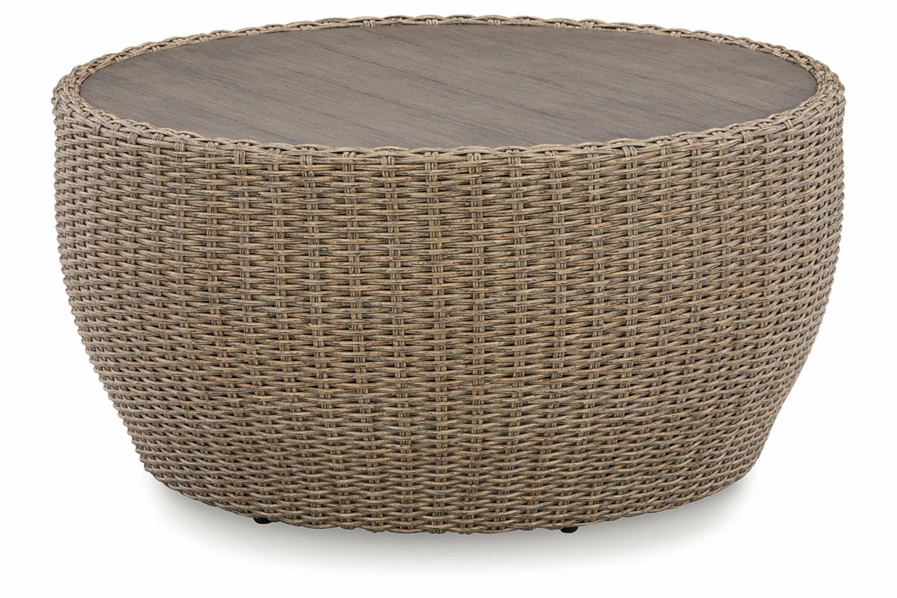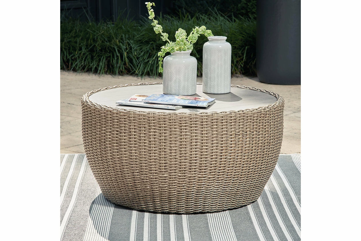 This coffee table completes your outdoor seating area with its fresh take on casual comfort. Handwoven resin wicker over a curving frame balances streamlined style and exceptional durability. An aluminum top polishes off the piece, acting as a perfect perch for snacks, beverages and decor.