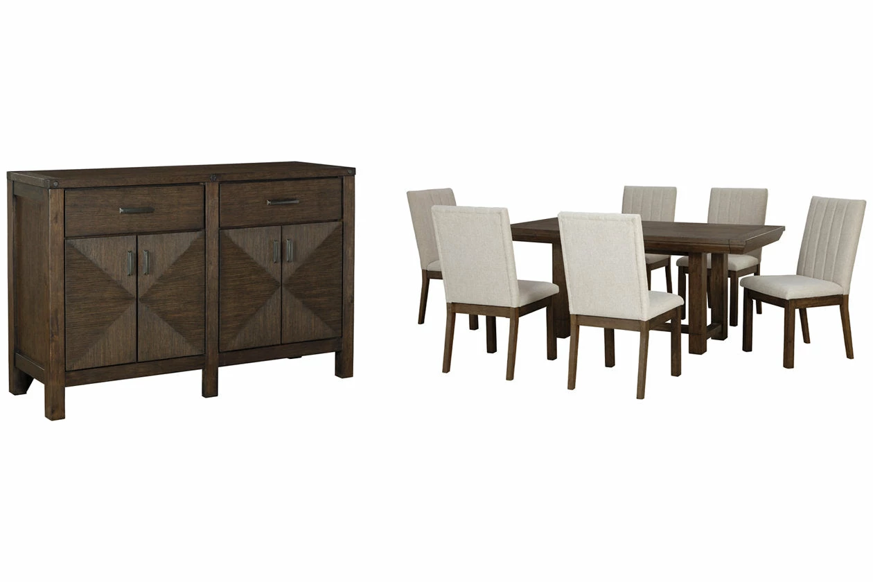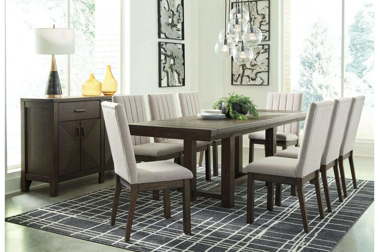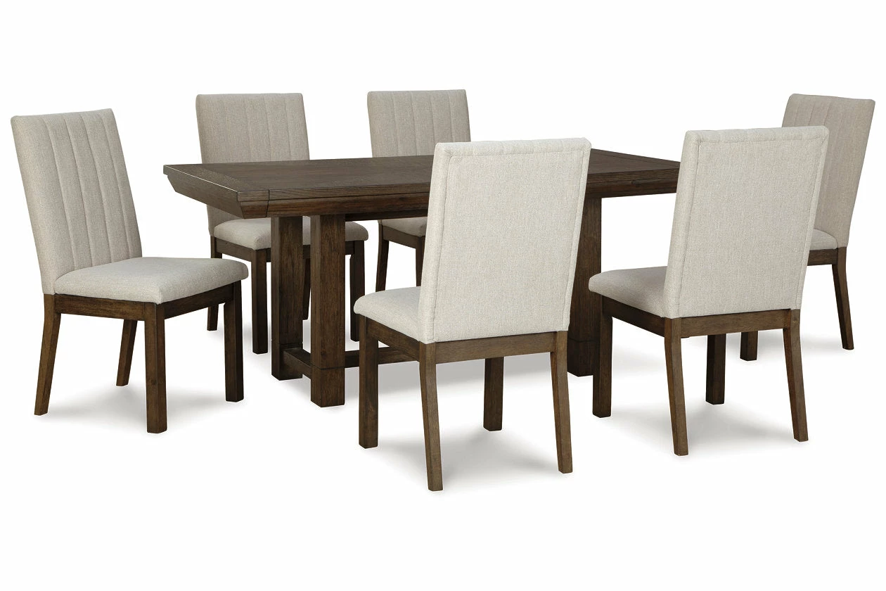 Feast your eyes on this stunning 7-piece dining room set. The table’s inlaid veneer top supported by a four-post trestle base is a look worth lingering over. When unexpected guests drop by, two extension leaves make entertaining a breeze. The chair’s crisp, clean-lined profile is softened with front-to-back upholstery that’s plush to the touch and easy on the eyes. Channel stitched detailing adds to the sense of luxury.