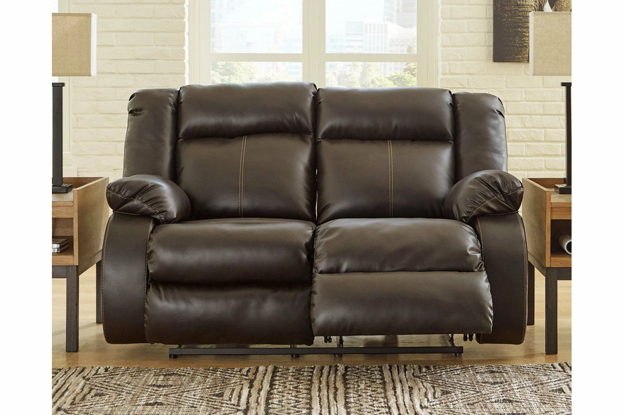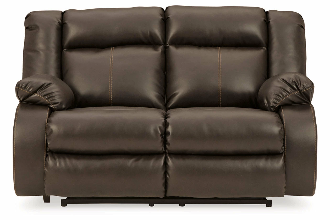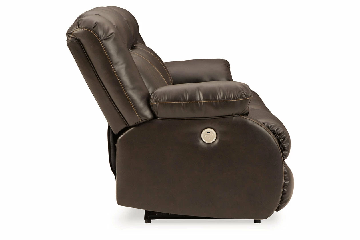 If highly contemporary looks and a heavenly feel sit well with you, rest your eyes on this reclining power loveseat. Decadently soft, the easy-care faux leather upholstery is enriched with jumbo contrast stitching and dramatic cut-and-sew lines for fashion-forward flair. Radius cut arm frame adds cool, curvaceous interest. At your fingertips: one-touch power control with a zero-draw USB plug-in that’s not only convenient but also energy efficient. When it comes to high style at a down-to-earth price, this power reclining loveseat really brings it home.