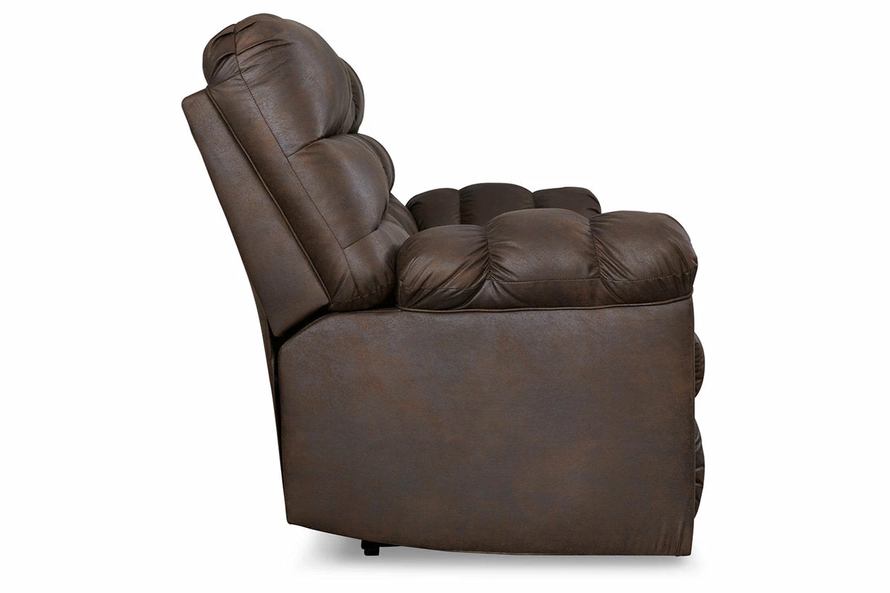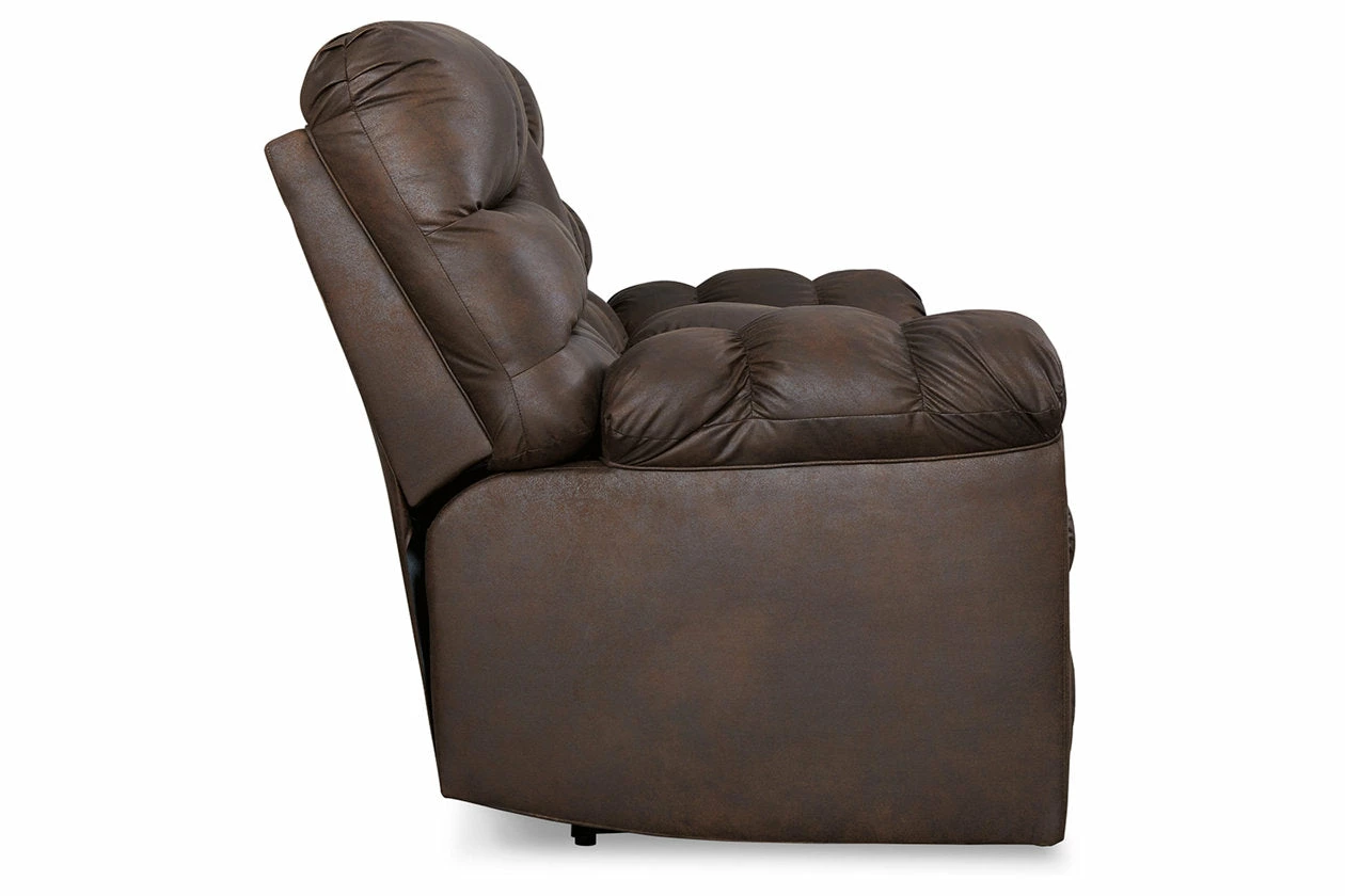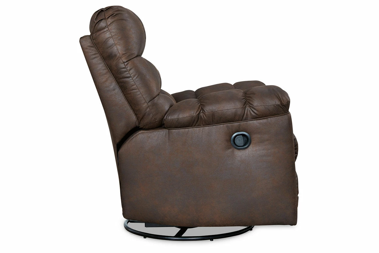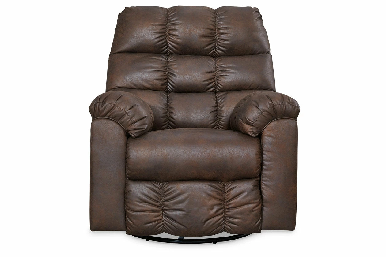 Rock the cool look of leather minus the hefty price tag with this glider recliner. Rich with tonal variation, the faux leather upholstery sure looks like the real thing. And talk about indulgent comfort. Double stuffed armrests and sumptuous cushions cradle and support in all the right places. Distinctive biscuit back design enhances this recliner’s contemporary flair. Smooth gliding motion and 360-degree swivel complete the experience.