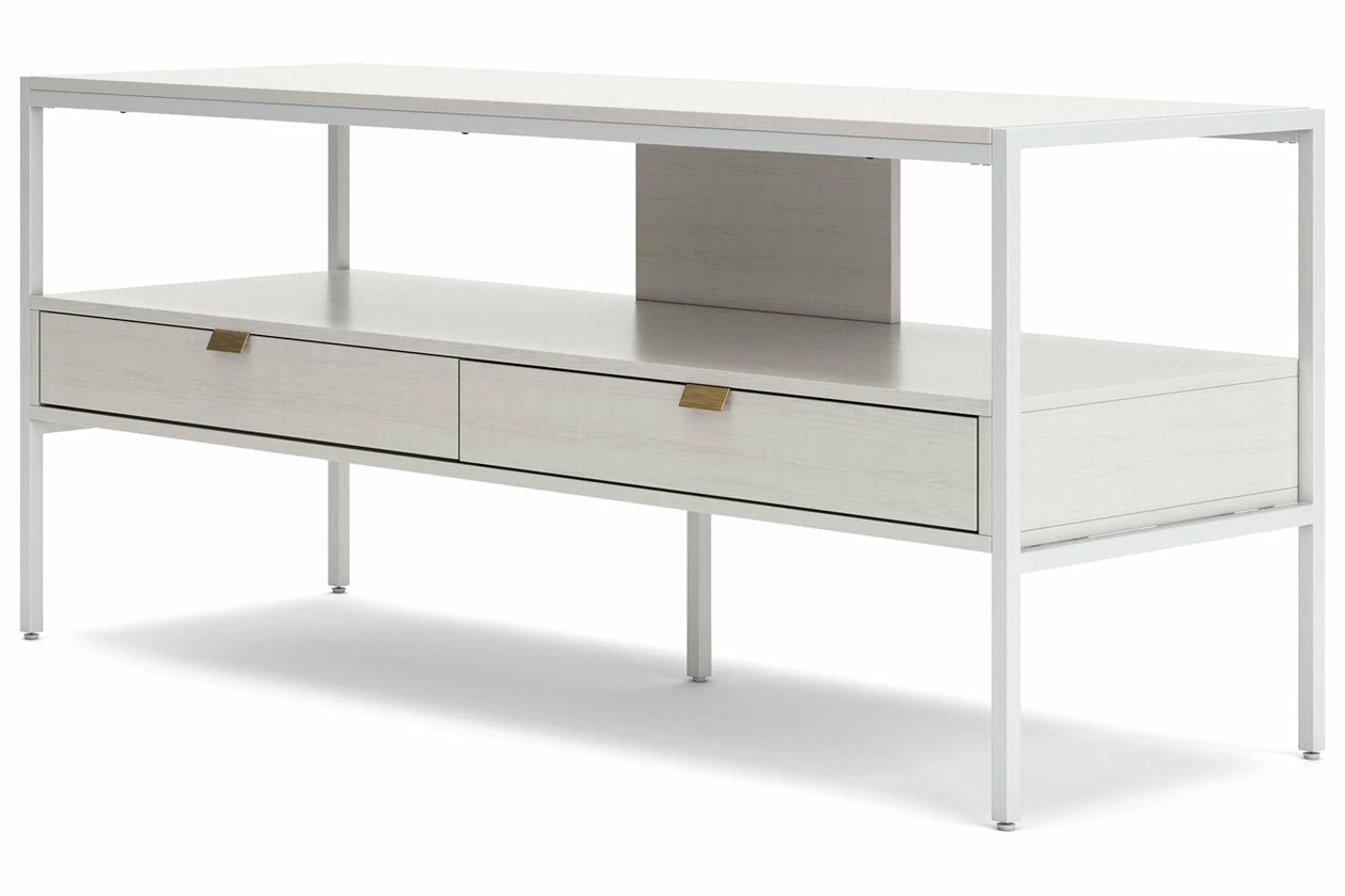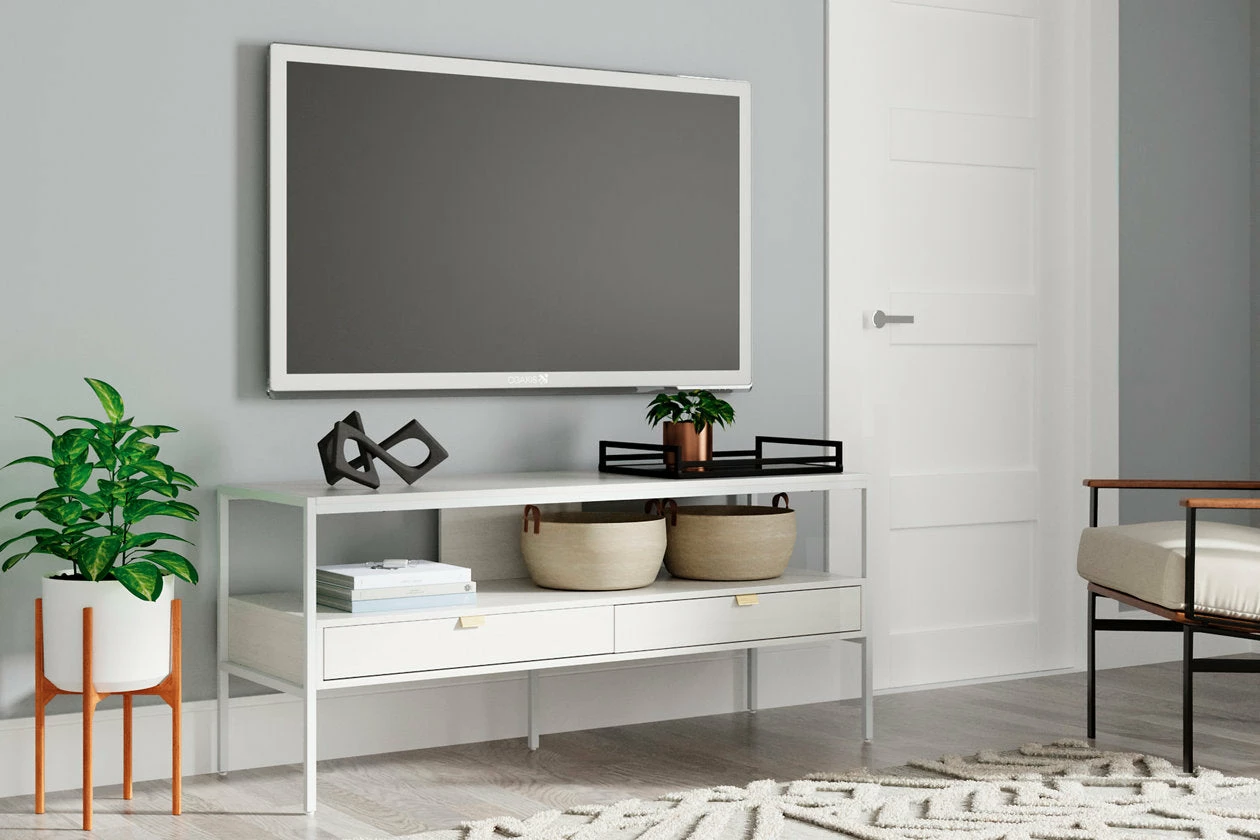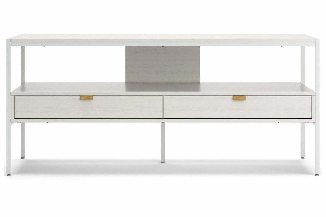 Bring your vision of a modern living room to life with this sleekly designed TV stand. Its linear construction and white finish keep things minimal. An open shelf and two drawers allow you to store in simply streamlined style, rounding out this versatile, striking piece.