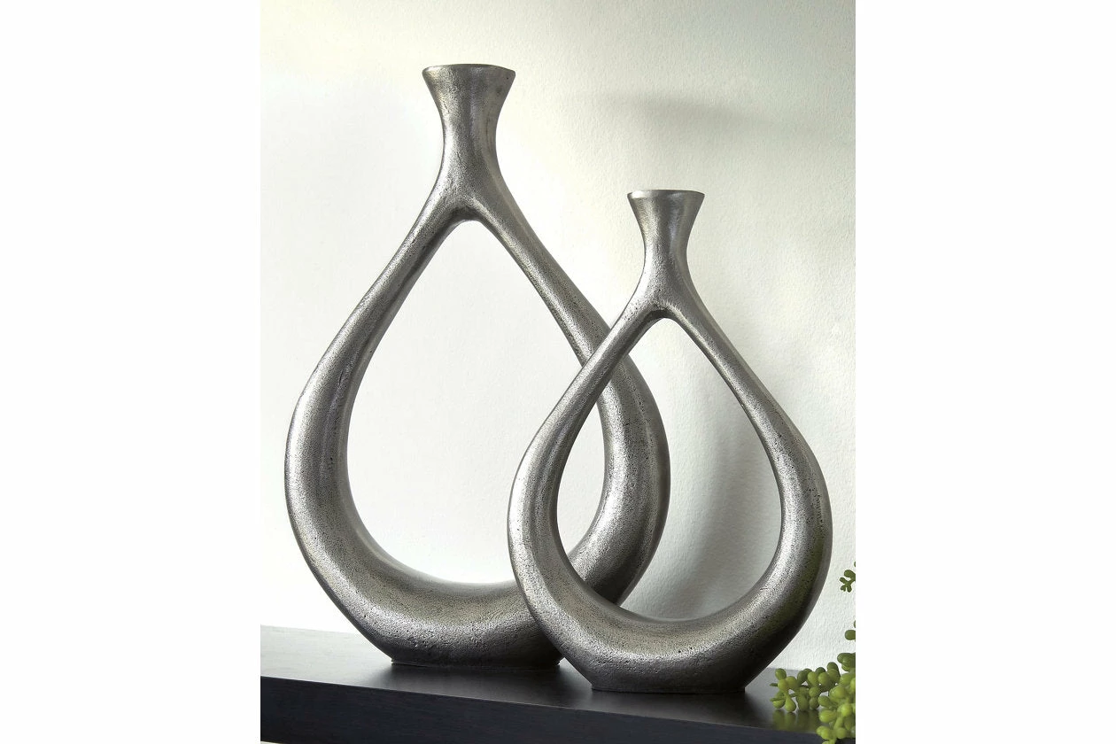 Make a splash with this vase set. The teardrop design with a cutout center is so eye opening. An antiqued silvertone finish is a striking contrast to the vases’ modern flair.