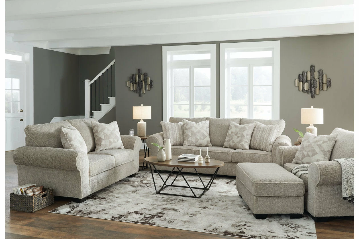 Everyday form, superb function. This seating package sets its sights on trendy transitional design. The neutral hue meshes with multiple color palettes, providing a chic look wherever you need it most. Roll arms add a dash of flair, while soft-to-the-touch fabric aids you in superior relaxation. Now that’s universal style, made simple.