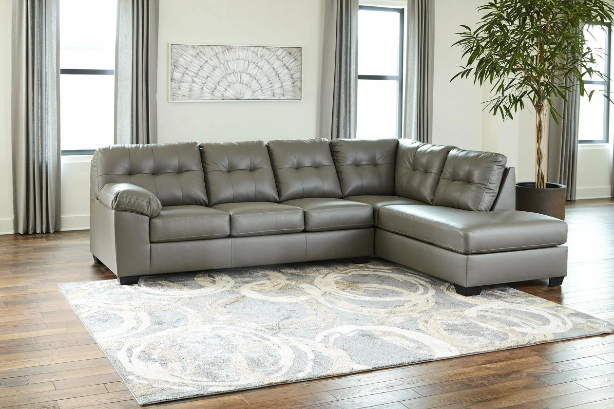 Dressed in glorious gray faux leather, this sectional is certain to be the center of attention. With tasteful tufting, padded armrests and a sleek tapered design, its generous scale lets you share the space with family or use it for entertaining when friends drop in.