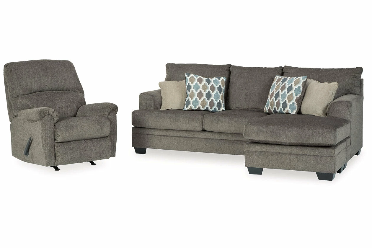 This contemporary sofa, loveseat and rocker recliner set has comfort written all over it. From the plush cushions to the textured gray fabric, it’s a total winner for relaxation. Designer throw pillows in blue, brown and tan complement the neutral upholstery of the sofa and loveseat while the rocker recliner invites you to kick back and relax.