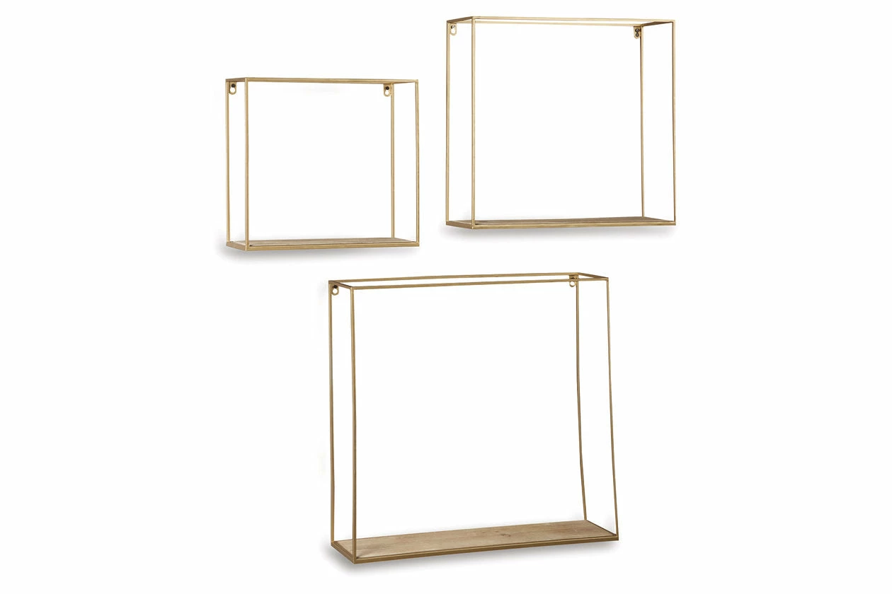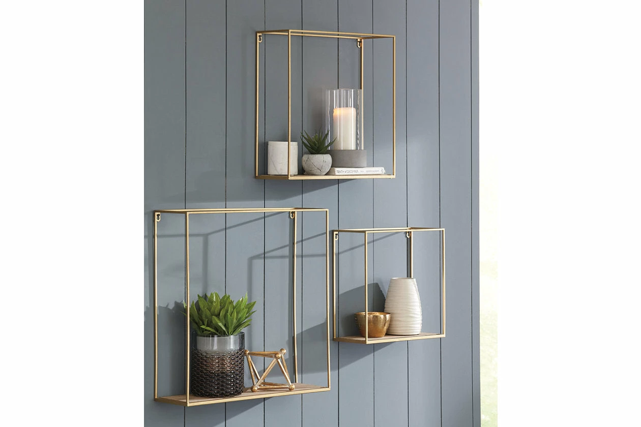 This 3-piece wall shelf set creates multi-dimensional appeal on your wall. Linear design is elevated with an unexpected fashion-forward combination of goldtone metal and natural wood. Varying sizes give you the freedom to showcase what you want, where you want.