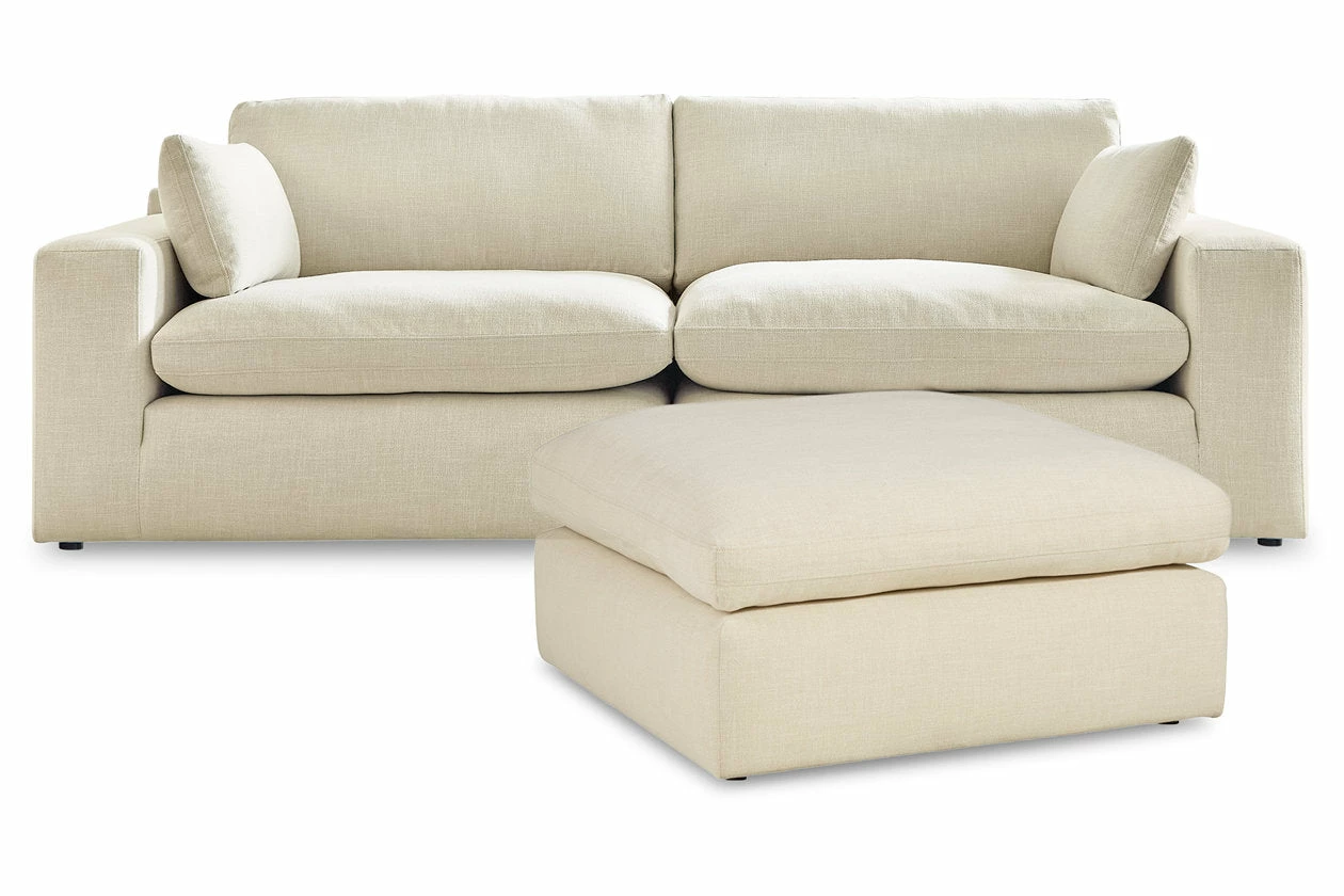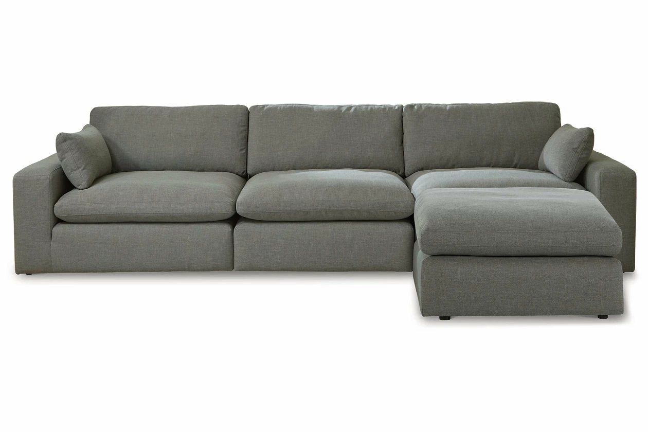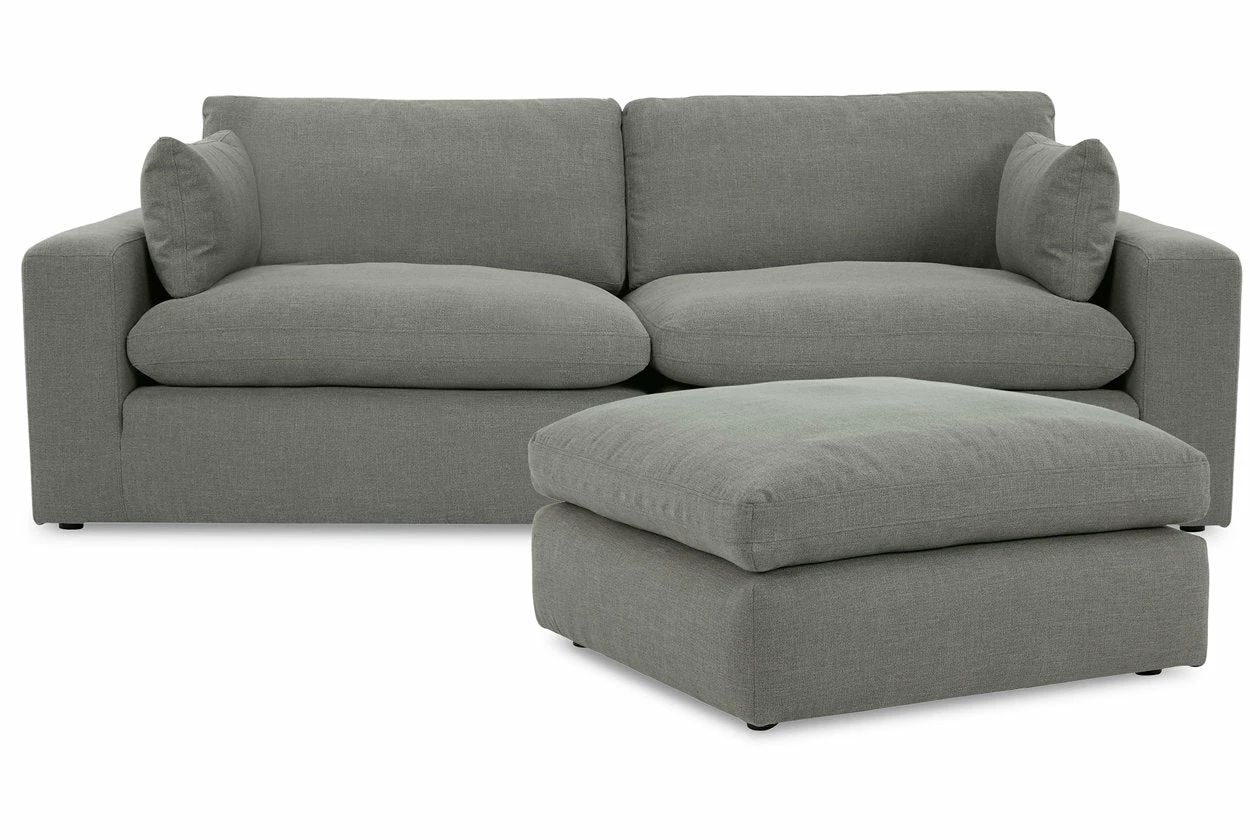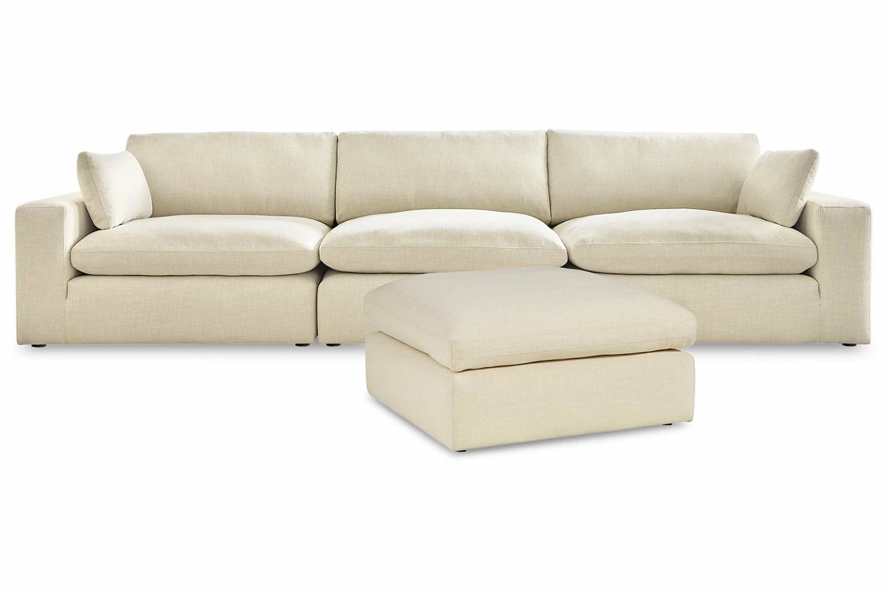 Down with uptown style. This sectional sofa and ottoman package goes to town with a high-design aesthetic, sleek sophistication and sumptuous comfort that are temptingly affordable. Wide track arms, softened by plush side pillows, offer a welcoming look and feel. The back pillows, seat cushions and ottoman top with fluffy feather fill bring added flair and indulgence. Best of all, the modular design lets you stage the pieces solo or group them in various configurations to suit your mood.