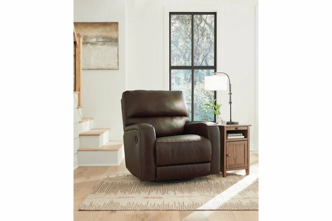 Embrace streamlined design. The sleek form of this swivel glider recliner is rich in tailored function. Its reclining, swivel and gentle rocking motions relax you in refined style. And the combination leather and faux leather upholstery, in a deep neutral, levels up affordable luxury.