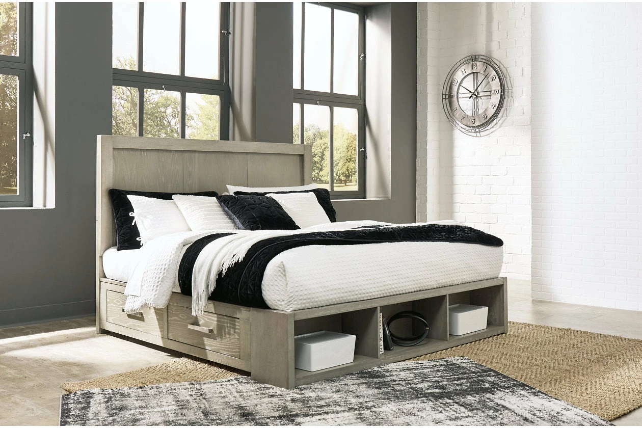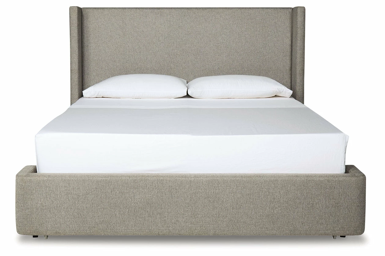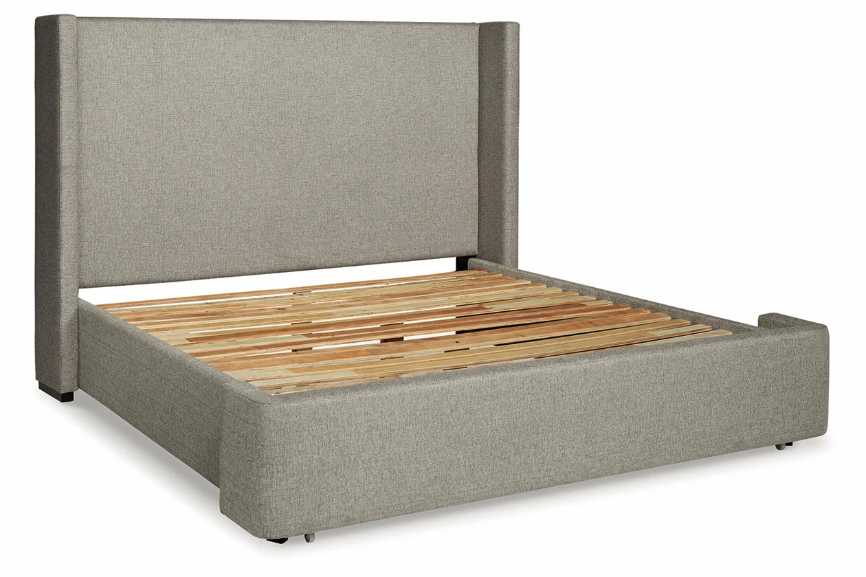 This California king upholstered storage bed has a clean, contemporary design with a relaxed sensibility. The sturdy silhouette is fully upholstered with a medium gray woven fabric. A winged headboard elevates the streamlined design, while the built-in storage drawer footboard provides savvy storage.