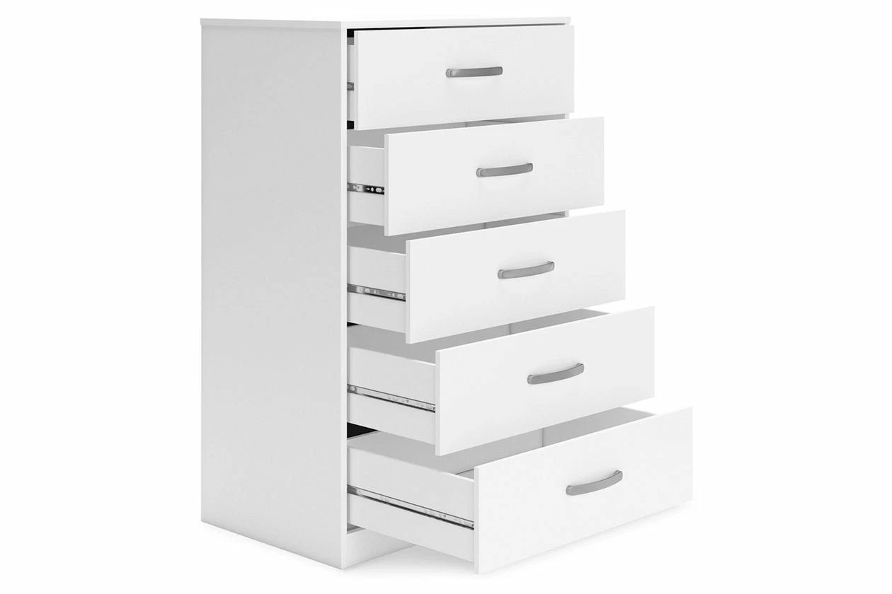 This chest of drawers has simple lines and contemporary styling, allowing it to blend seamlessly with any decor. Five spacious drawers slide easily on metal ball bearings and can be used to keep your clothes neat and organized. Sleek metal pulls in a brushed nickel-tone finish add to the streamlined aesthetic. Combine with other units in the collection to create a room that’s smart and stylish.