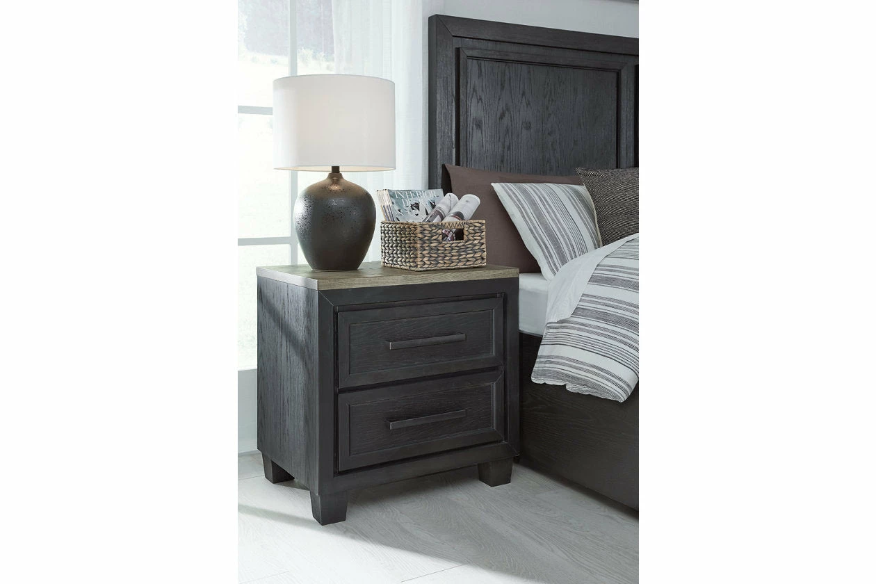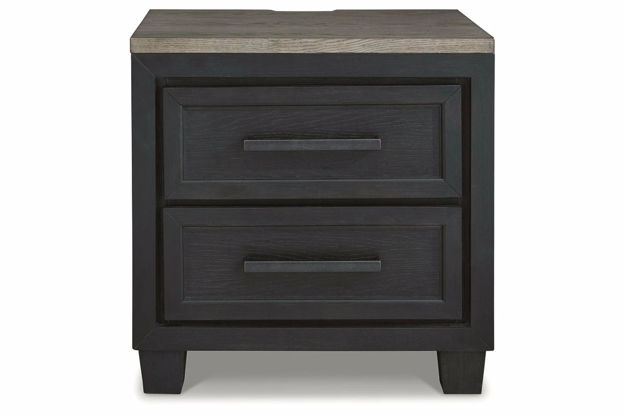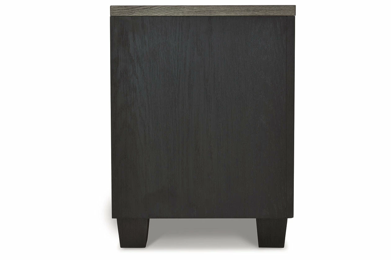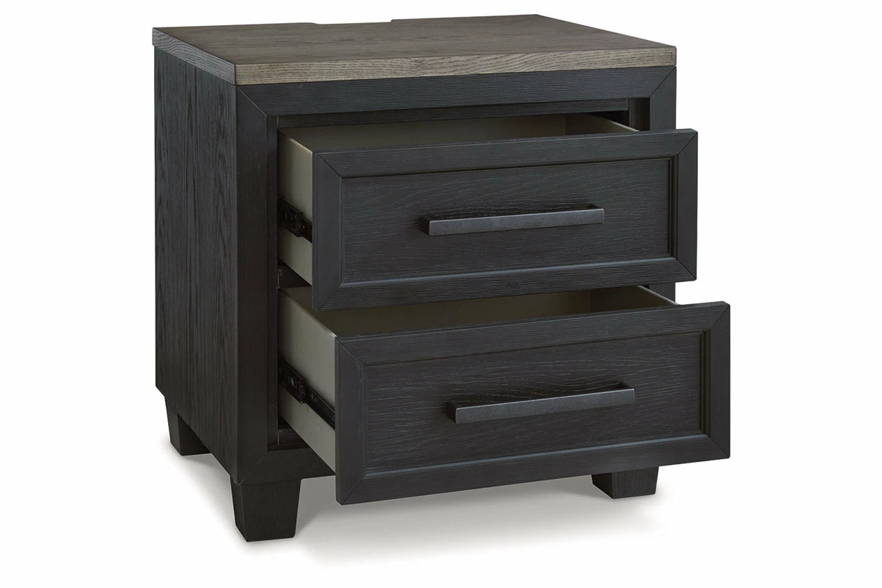 This nightstand is casual contemporary style simply done right. Its two-tone color scheme features a rich brushed black main color accented with a beautiful dusty grayish brown wood tone. Two drawers with sleek black pulls offer plenty of storage for your bedside essentials. The nightstand marries tech and clean-lined design, with a dual USB charging port along the upper back edge to keep your devices powered all evening long.