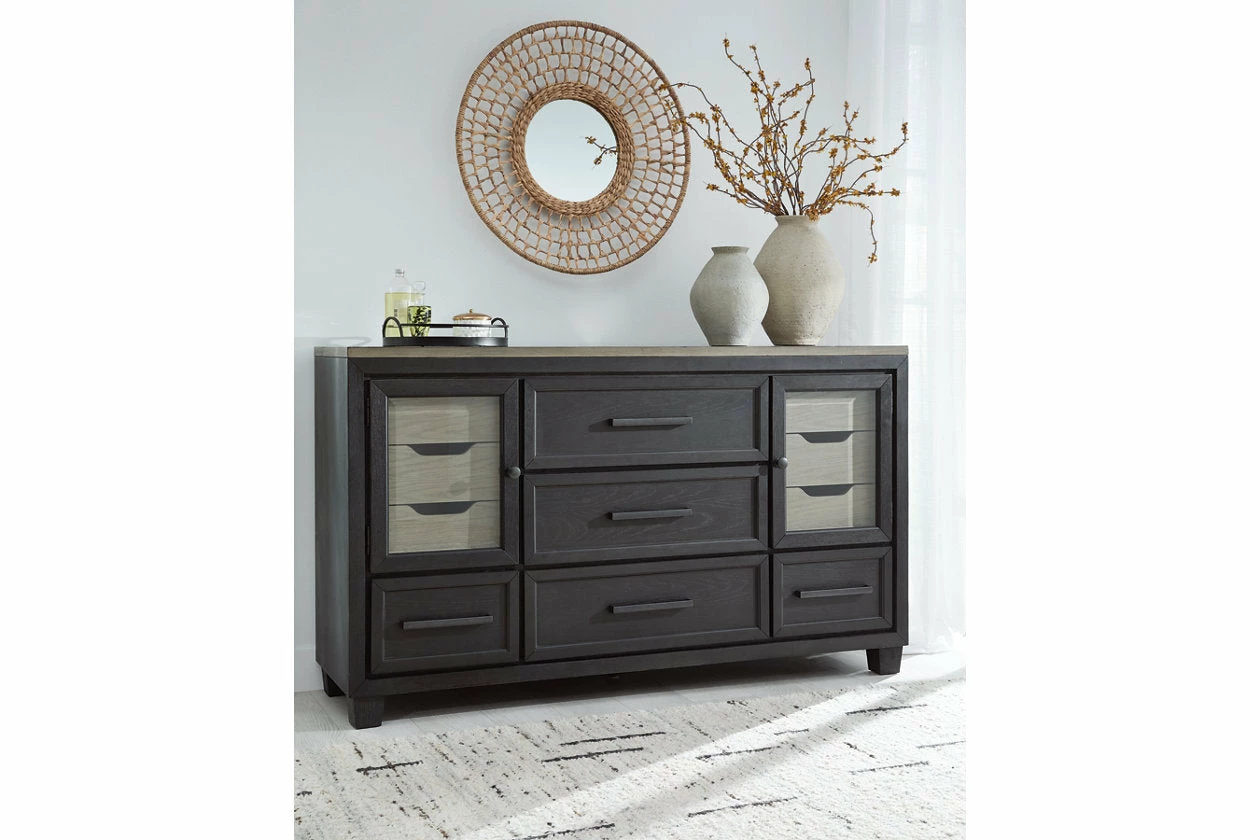 This dresser is casual contemporary style simply done right. Its two-tone color scheme features a rich brushed black main color accented with a beautiful dusty grayish brown wood tone. With 11 soft-close drawers (three located neatly behind each door) this dresser offers plenty of storage to accommodate your wardrobe needs with ease.