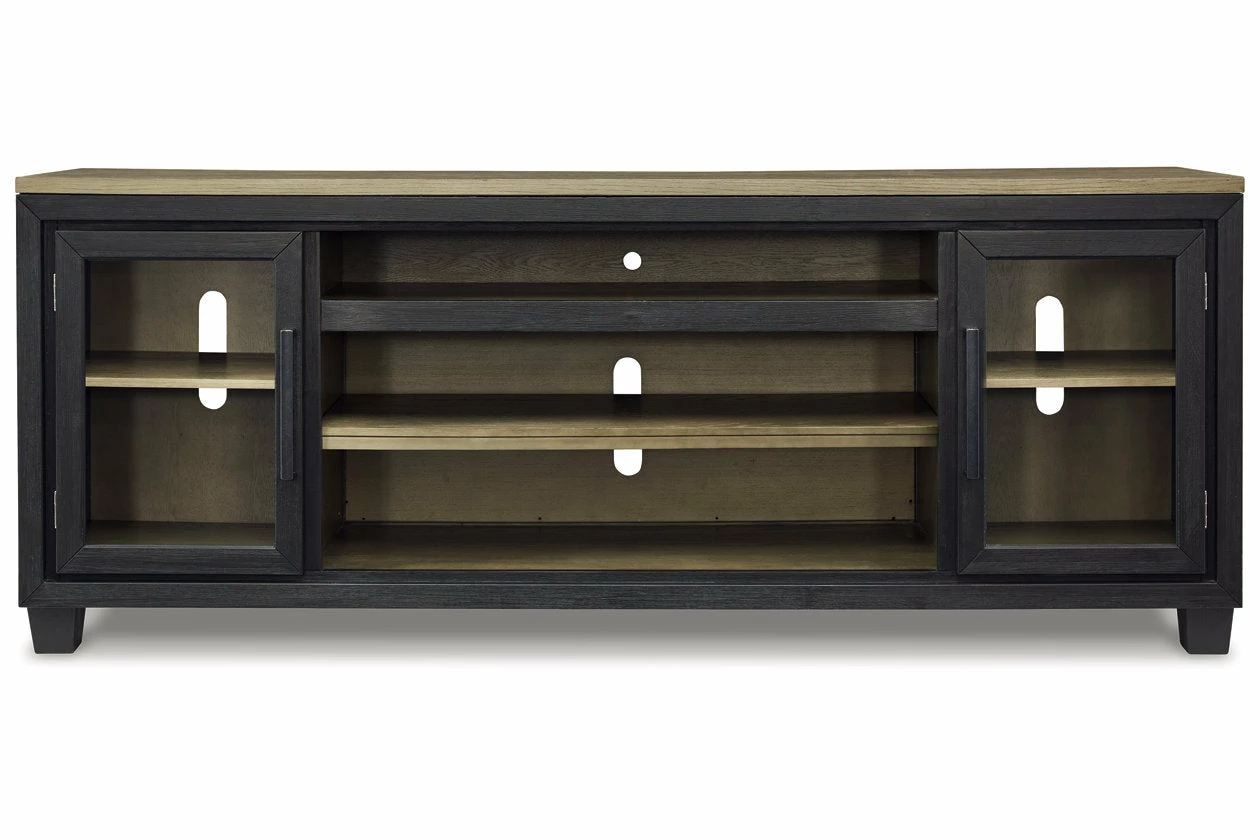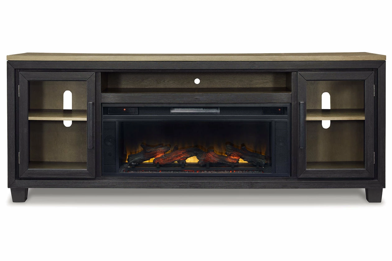This TV stand with fireplace option is rustic, casual contemporary style simply done right. Its two-tone color scheme features a rich brushed black finish accented with a dusty grayish brown wood tone. With two glass-front cabinets (each with an adjustable shelf), an open cubby and a removable center shelf, it offers plenty of storage to house all of your electronic needs. Compatible with W100-12 electric LED fireplace insert (sold separately).