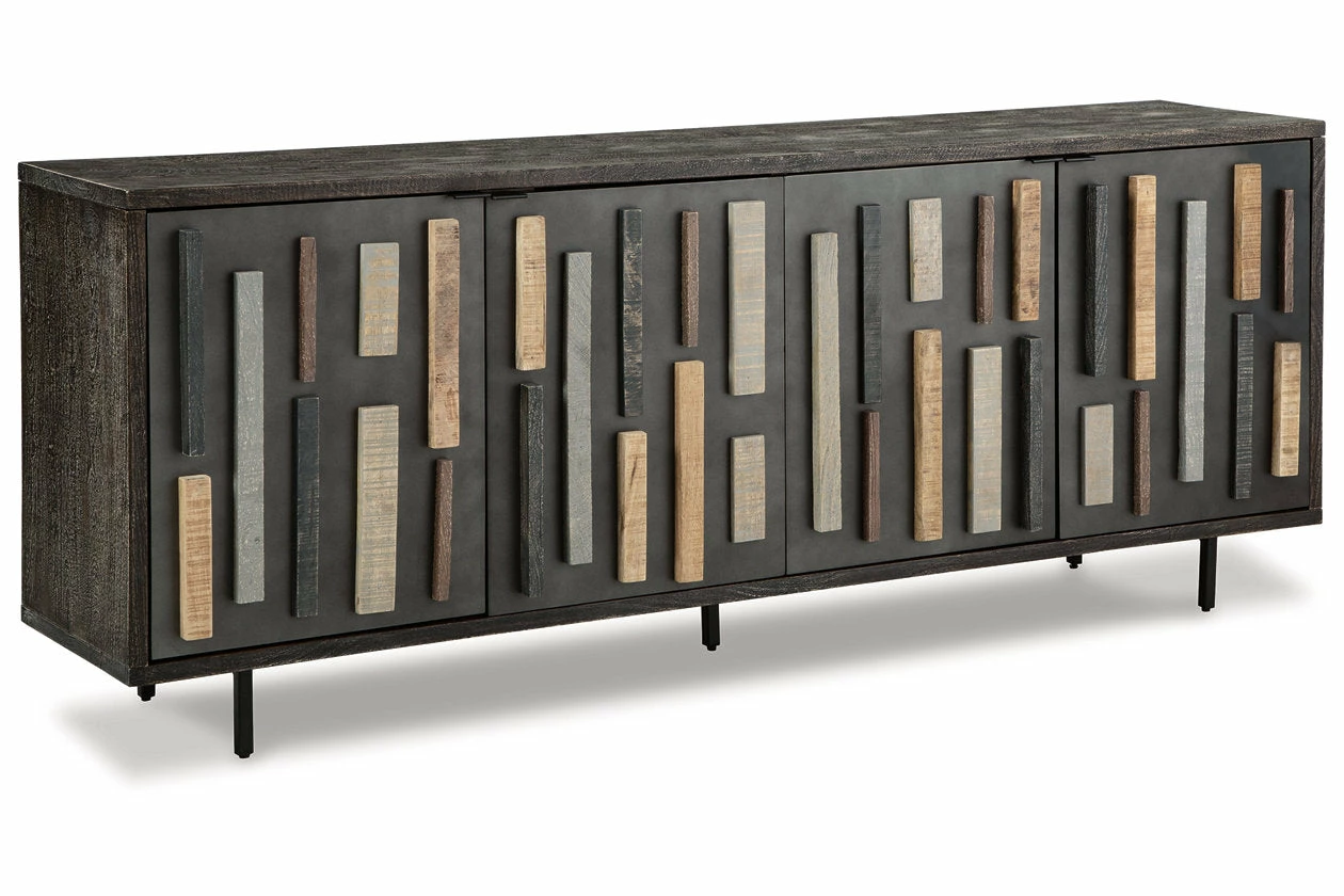 Elevate your contemporary home to a haven with an undeniably artistic attitude. This accent cabinet has a forward-thinking flair, featuring a modern mosaic created by strips of wood in varying hues against a dark brown and metallic gray finish. Fashionable and functional, the detailed doors open to reveal two shelves to suit all your storage needs.