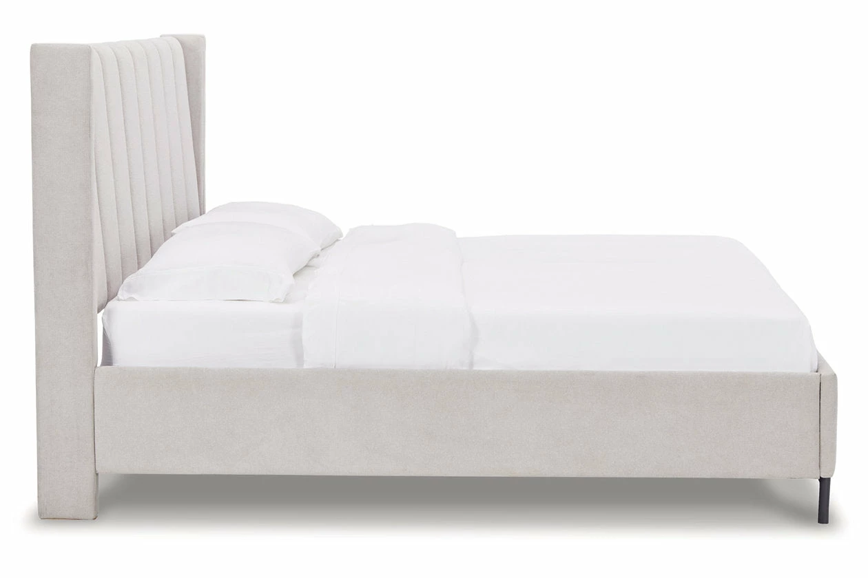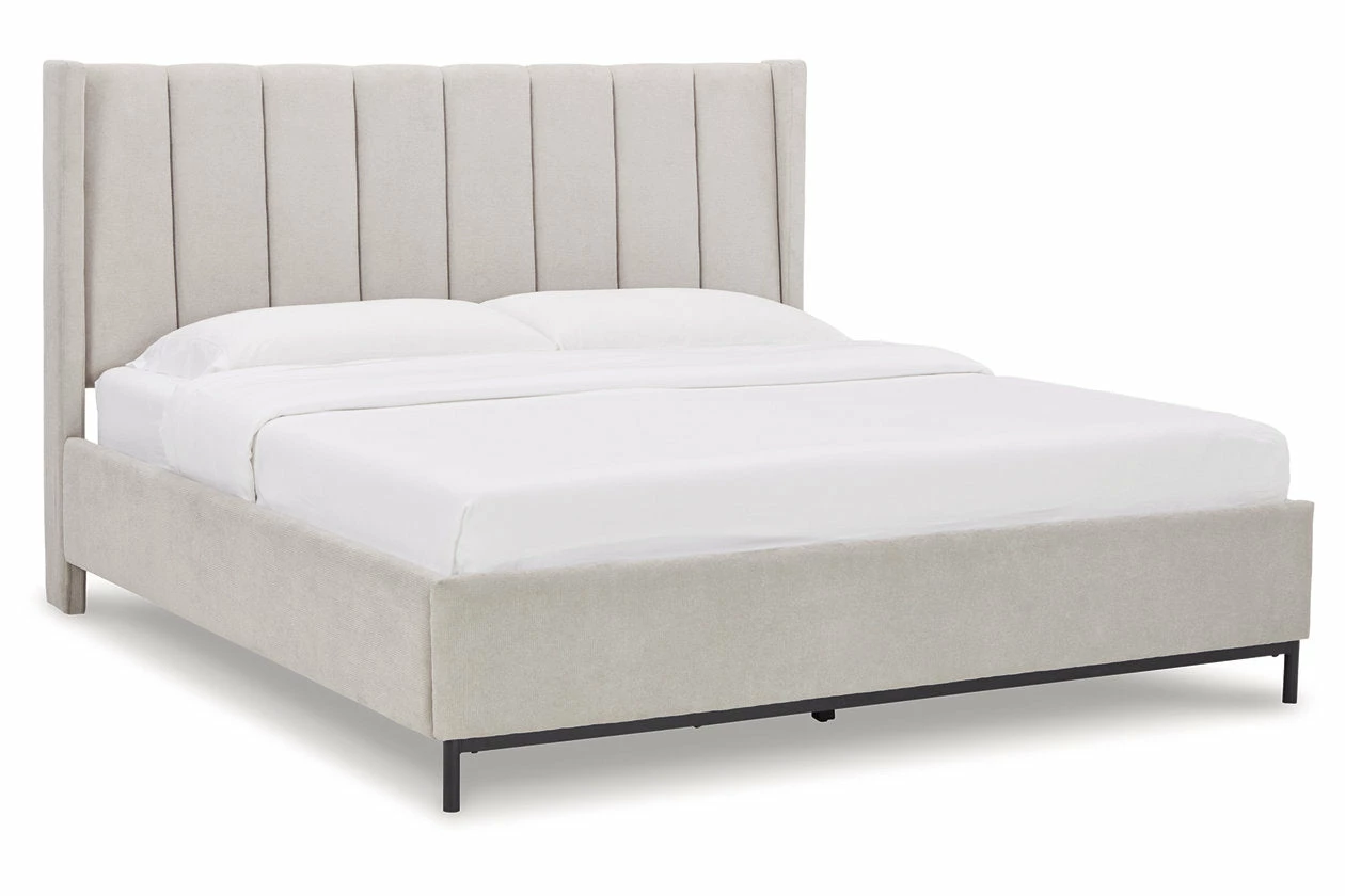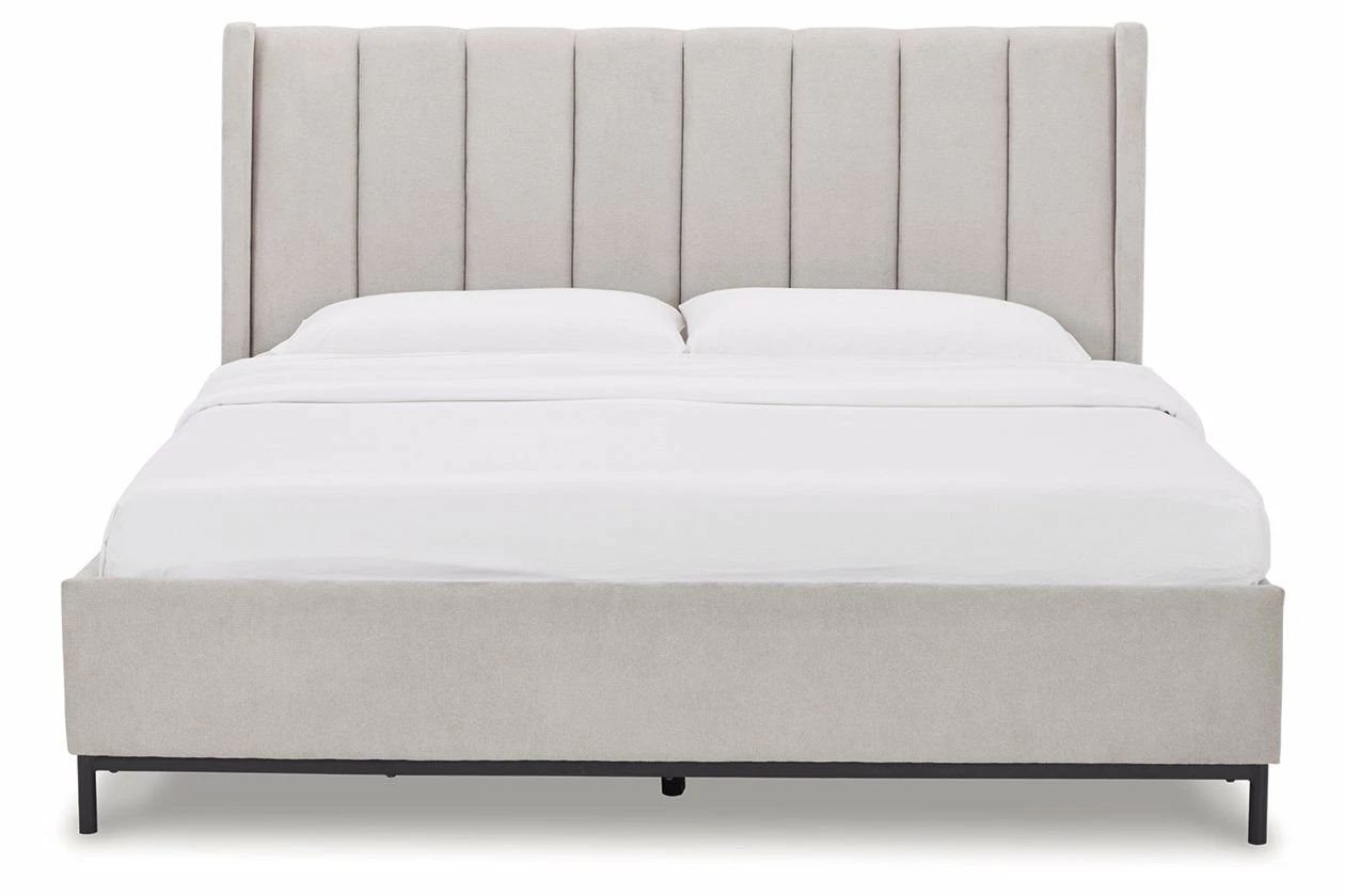 Casual contemporary design with a clean silhouette. That’s the beauty of this California king upholstered panel bed. Featuring a shelter wing design, the deep-channeled headboard panel is covered with a light gray fabric highlighted with a contemporary waffle-weave texture. Its upholstered side rails and footboard complete the streamlined look. The bed’s cool metal base coordinates beautifully with the less-is-more profile.