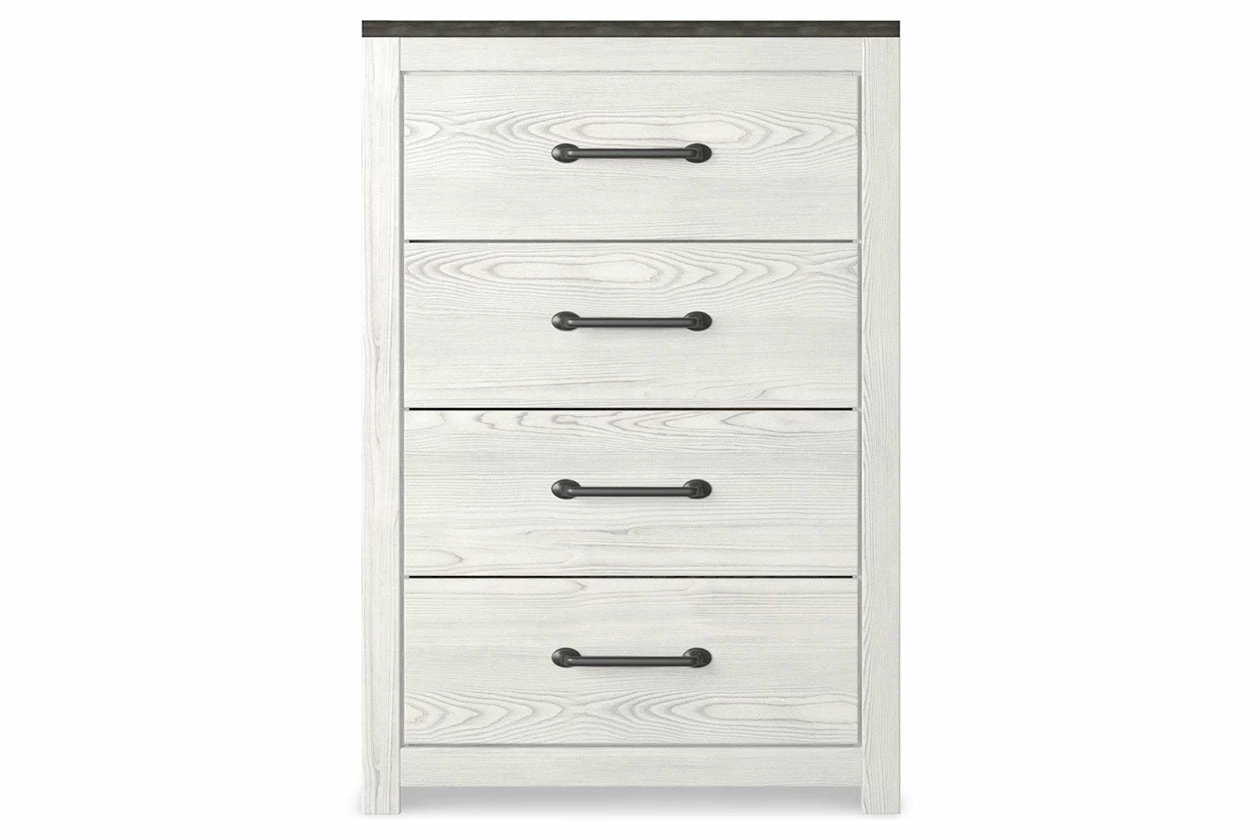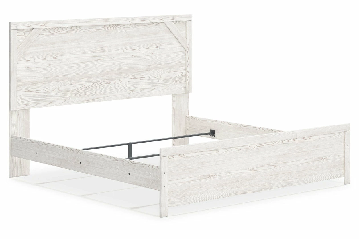 Cool, clean and casually modern. This king panel bed’s white rustic finish sets the tone for your calming sanctuary. Matte black sconce lights and an abstract design on the headboard bring a fresh look to the bed’s simply stunning profile.