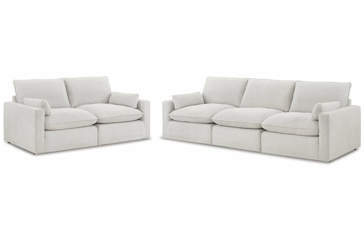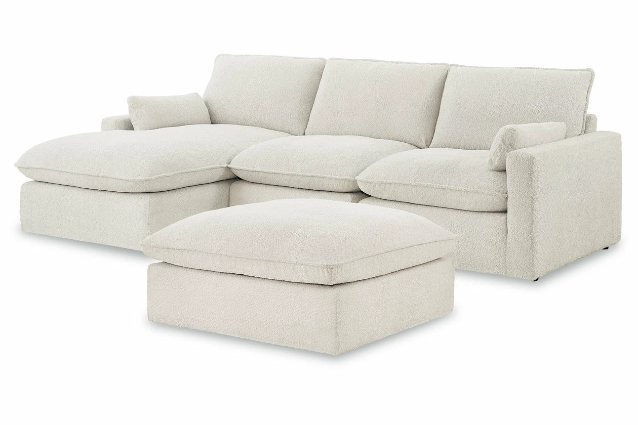 Kick back in blissful comfort with this boldly designed sectional and ottoman package. The set’s neutral upholstery gets a deliciously dramatic twist with flange welting and a boucle-like weave on the fabric. Plush feather-fiber blend cushions, deep seats and on-trend track arms merge cozy seating with a contemporary aesthetic.