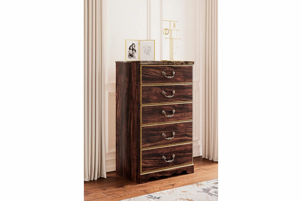 Timeless and classic, this chest of drawers offers a grand design accented with rich hues and eye-catching details. Stately from every angle, its sophisticated elements blend together to display your love of the traditional aesthetic.