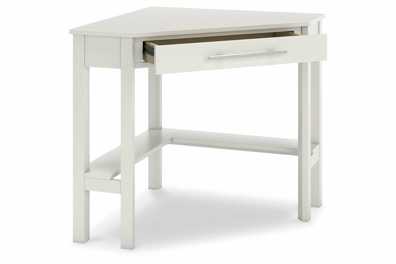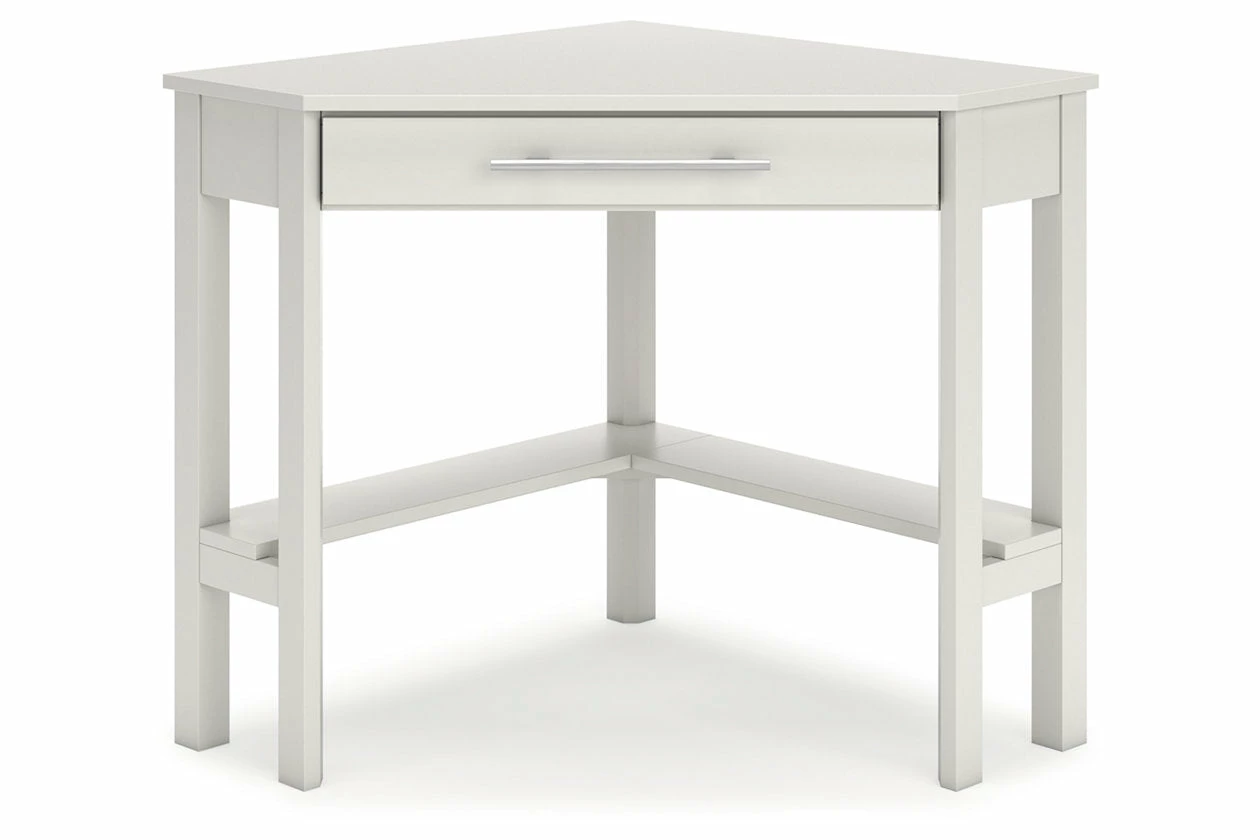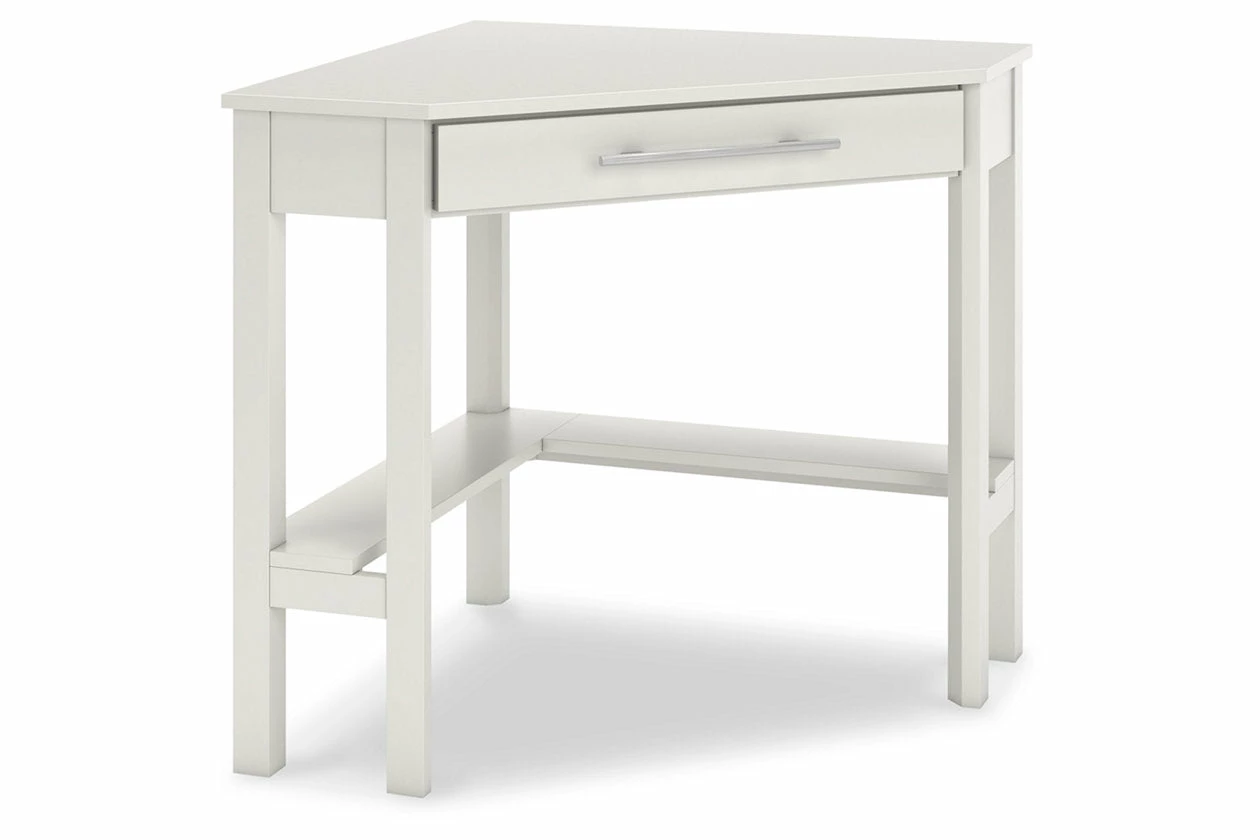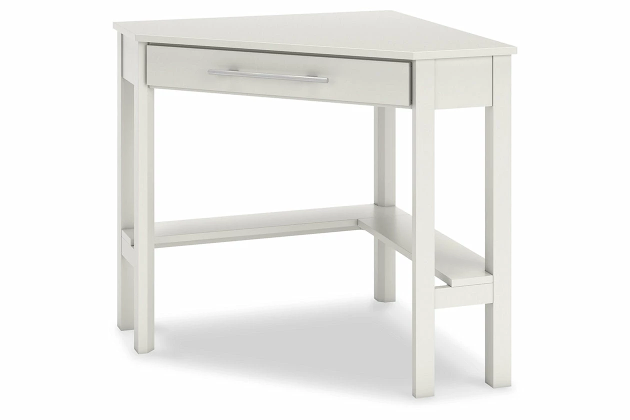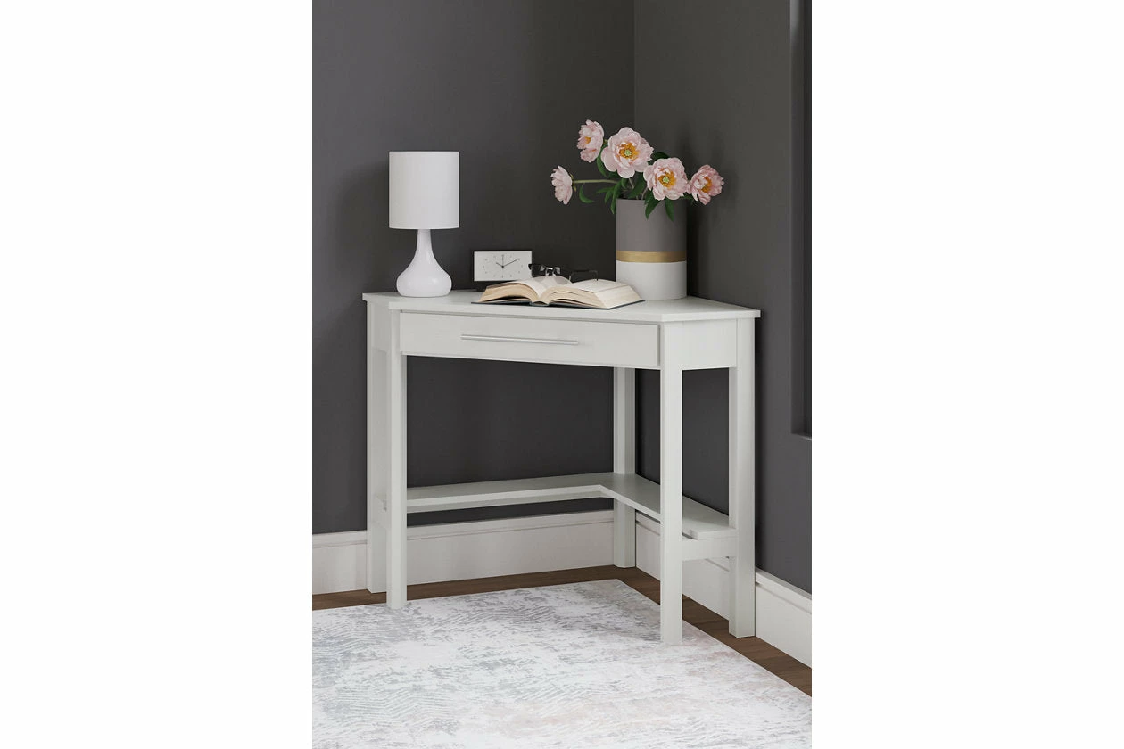 Clean-lined design takes center stage with the Otaska home office corner desk. Well-suited to small spaces, this desk leaves a small footprint as it seamlessly fits into corners. A center storage drawer keeps essentials close, while the crisp white finish suits a myriad of contemporary color palettes.