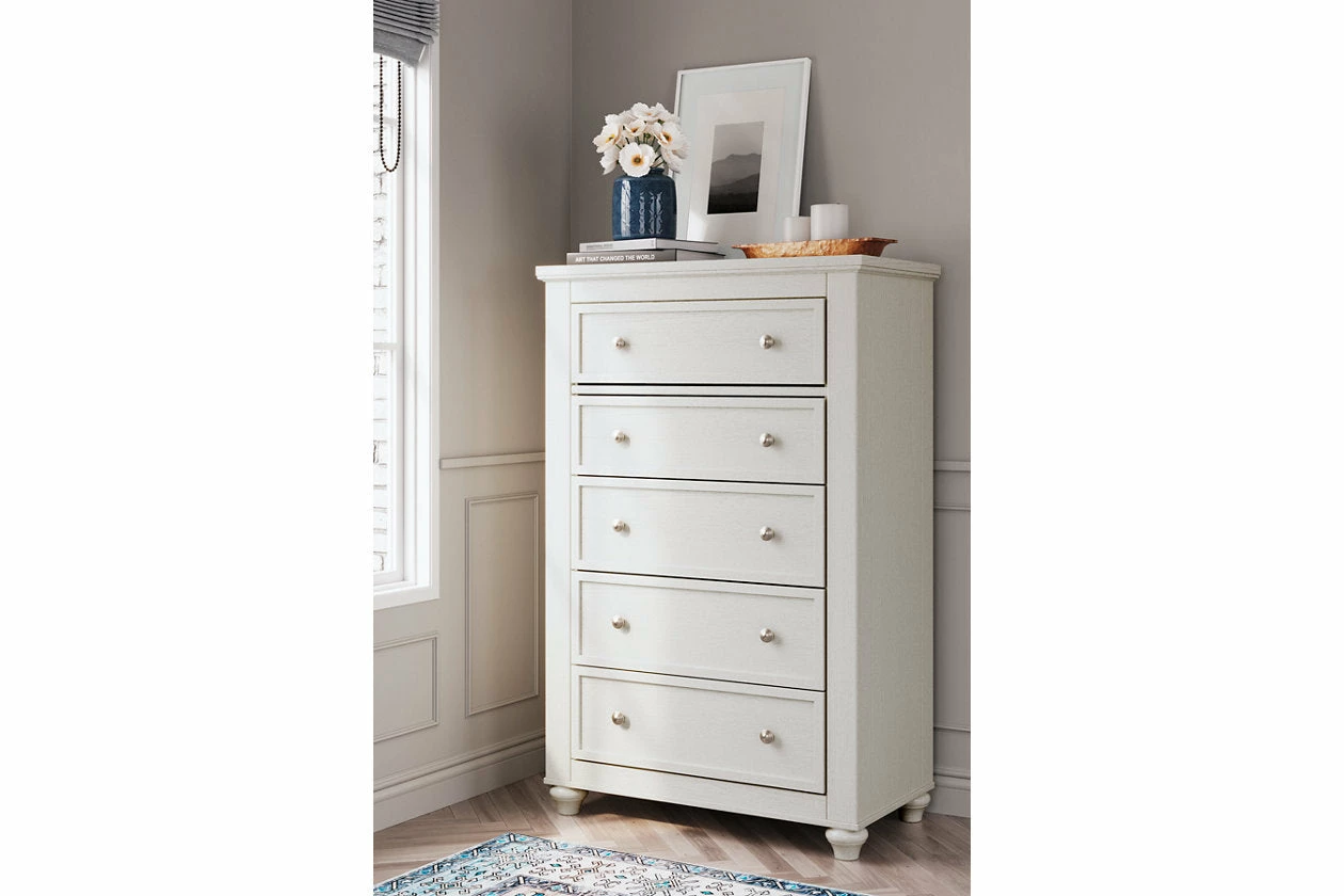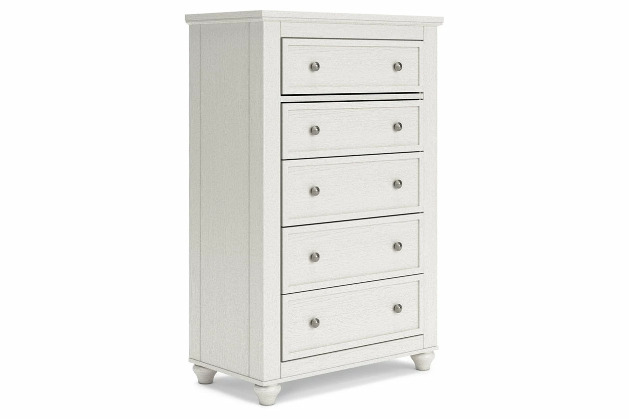 Brighten up your bedroom with this 5-drawer chest. The piece delights with a soft white finish and cottage quaint styling. When done in the right color, even a simple design can take on a fashionable flair.