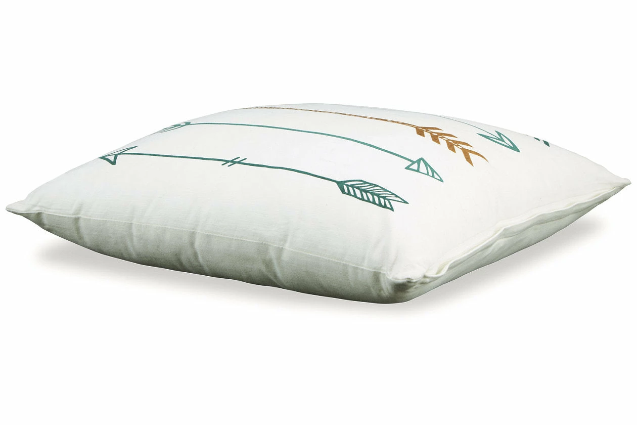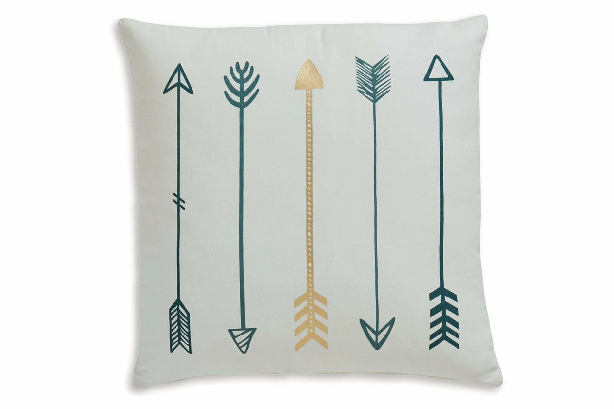Add a distinctive piece of decor to your room with this accent pillow. Adorned with a pattern of arrows in teal, white and metallic goldtone, this striking print adds a splash of style to any decor. Featuring a cotton cover with knife edge construction and zipper closure, this pillow is perfect for use on a bed or chair to freshen up your living space in a beautiful way.