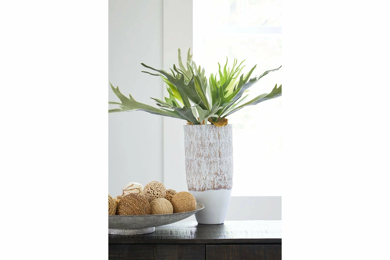 Whether serving as the centerpiece to your dining table or filling in a space in your etagere, this vase has a relaxed sensibility that grounds your decor. Its antiqued white finish is versatile, complementing a myriad of palettes with an air of casual elegance.
