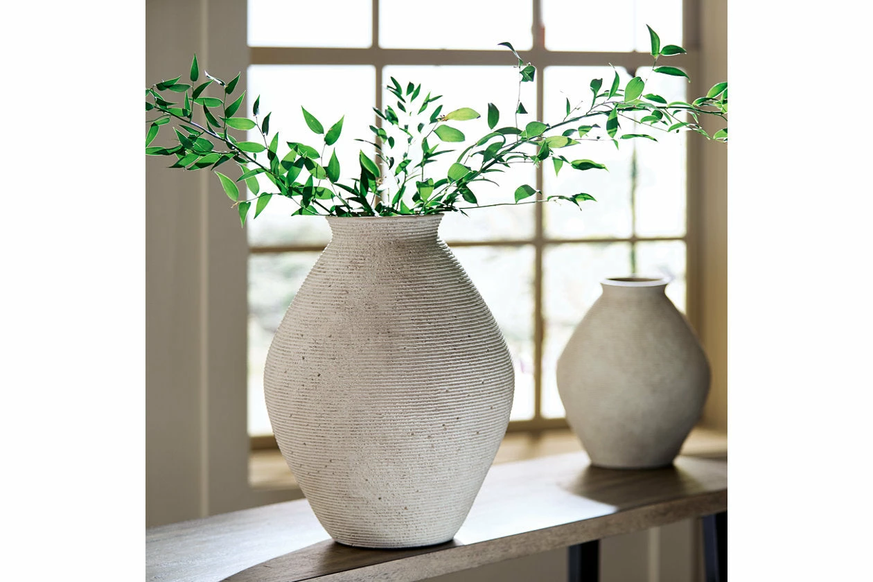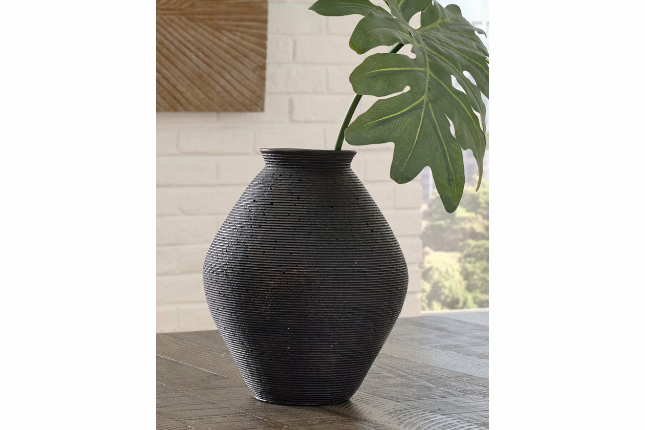 Ribbed textural rings give this vase a wonderful artisanal quality. An antiqued brown finish catches the eye, drawing attention to this elegantly earthy centerpiece.