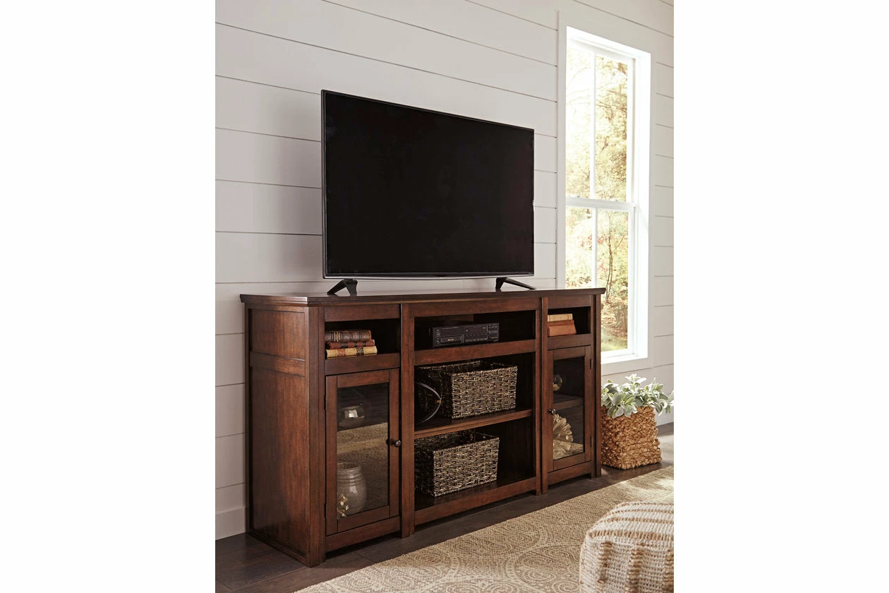 Need a stylish home for your television? This classic TV stand is masterfully crafted with entertainment needs in mind. You’ll be fascinated with the robust feel and functionality of this remarkable stand. The recessed top center shelf accommodates a sound bar or other technology, while the lower adjustable center shelf is ideal for media storage. Two side cabinets with handsome glass doors allow more space to neatly keep things.