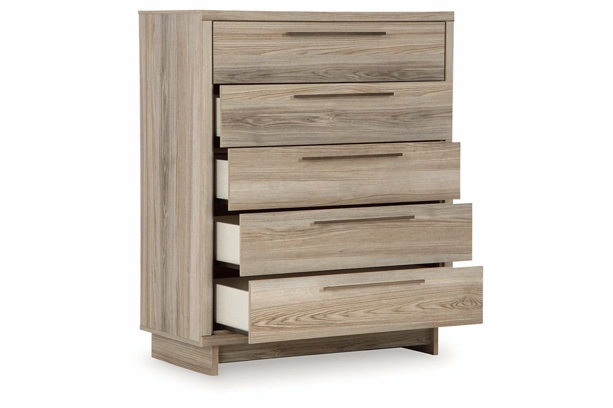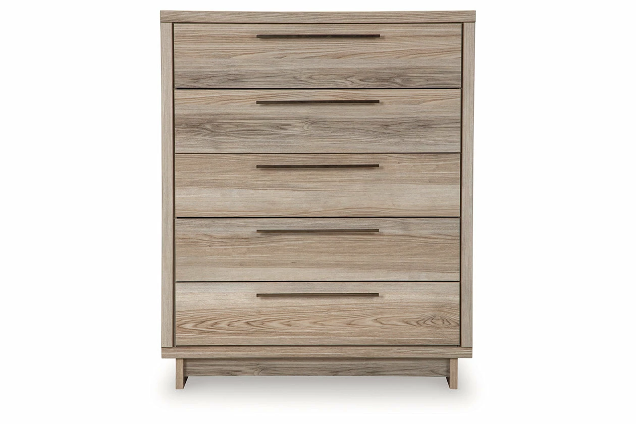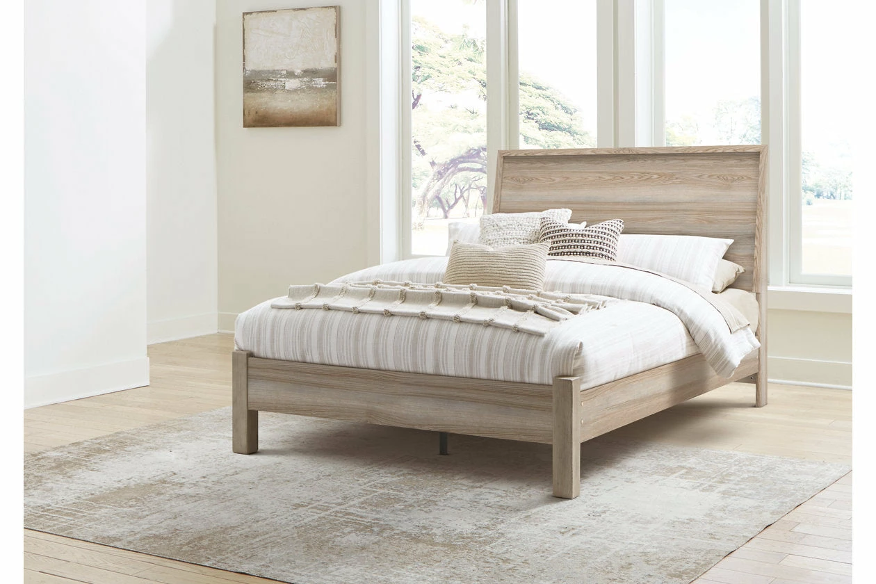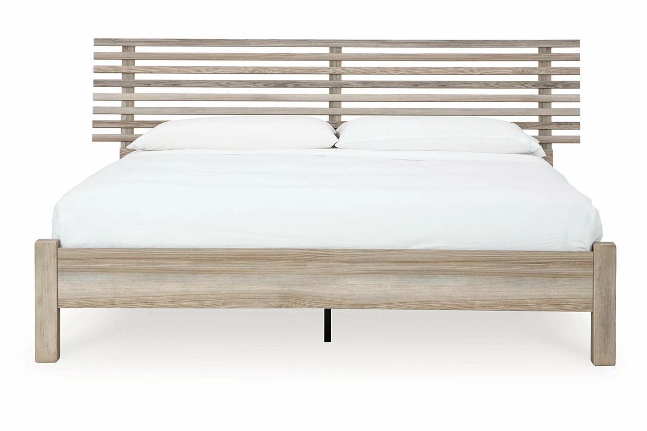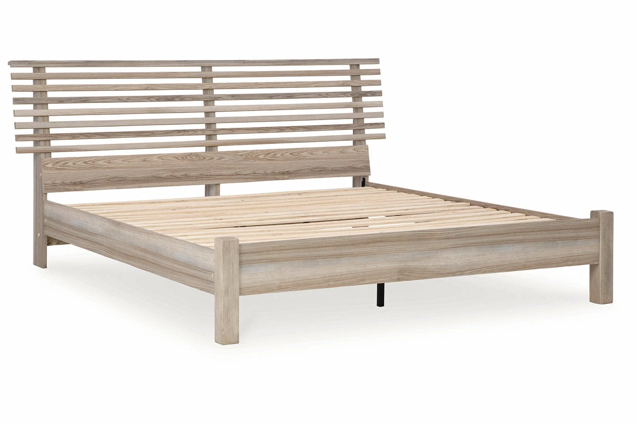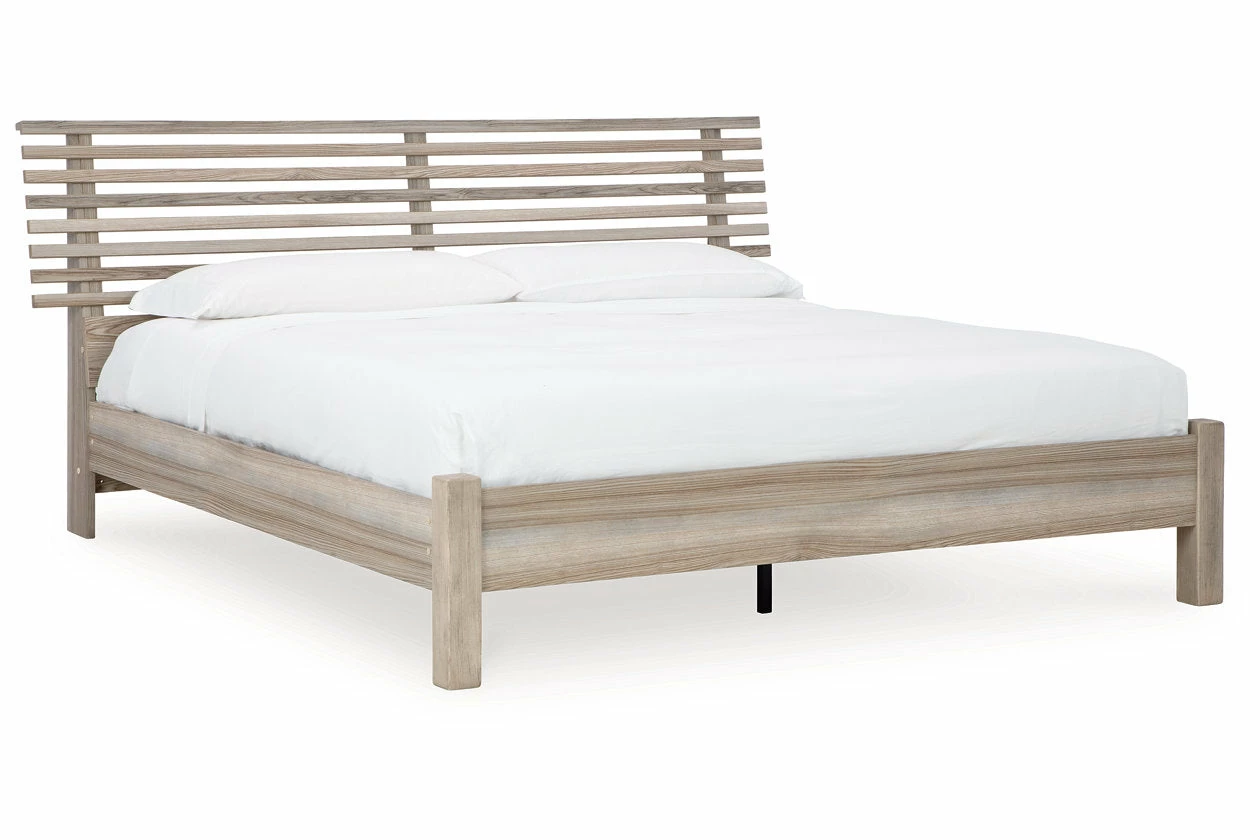Modern meets neutral and sophisticated in this king panel bed. Its clean lines and open slat headboard wake up your bedroom with eye-catching appeal. The natural finish and subtle replicated wood grain speak casual simplicity, creating a smart and stylish bedroom retreat. A refreshing take on style, indeed.