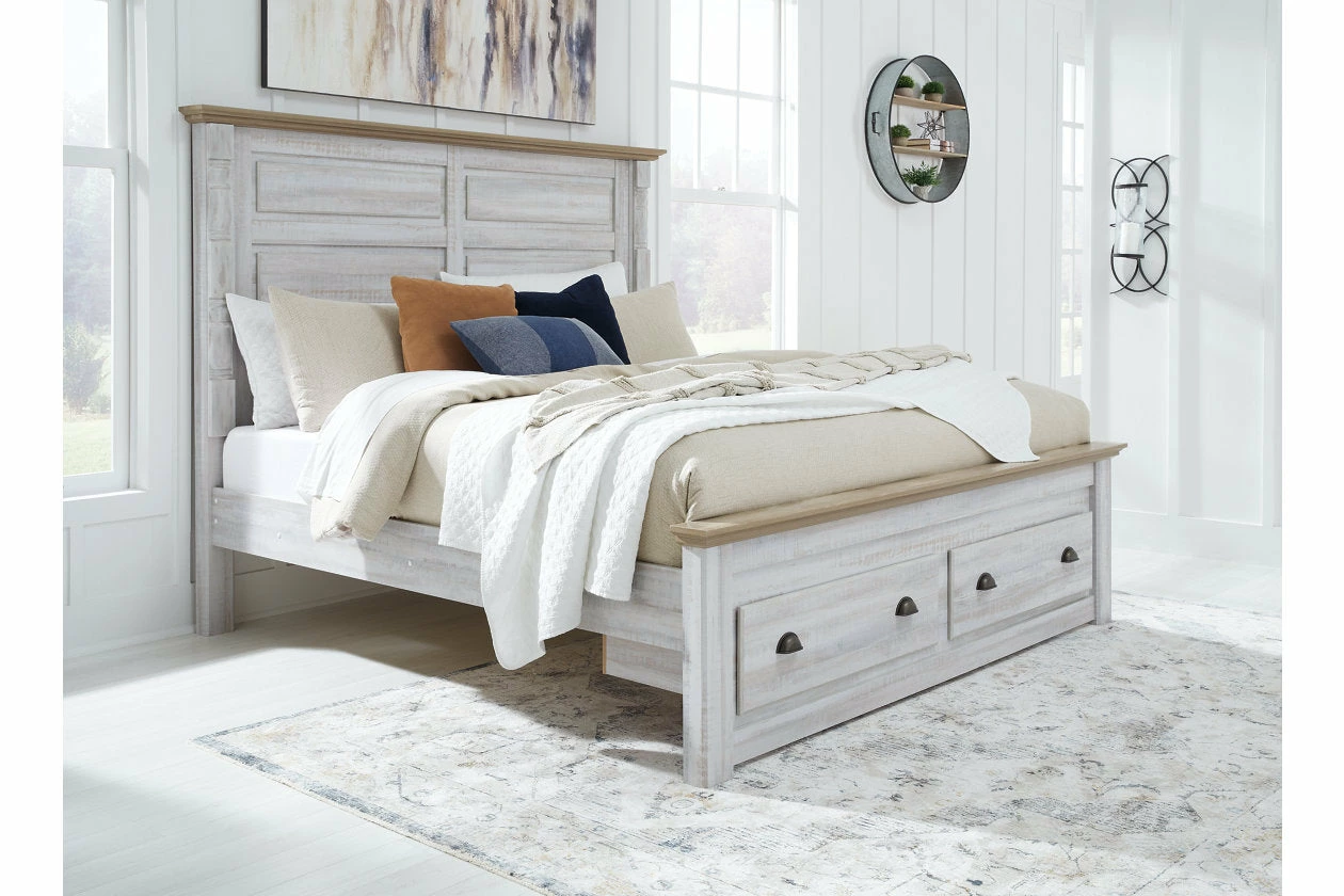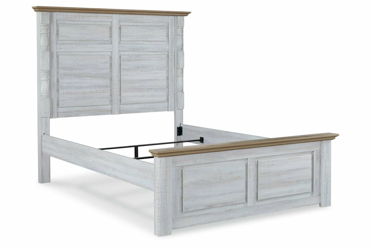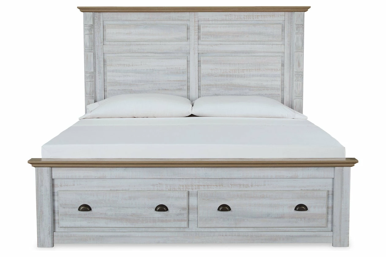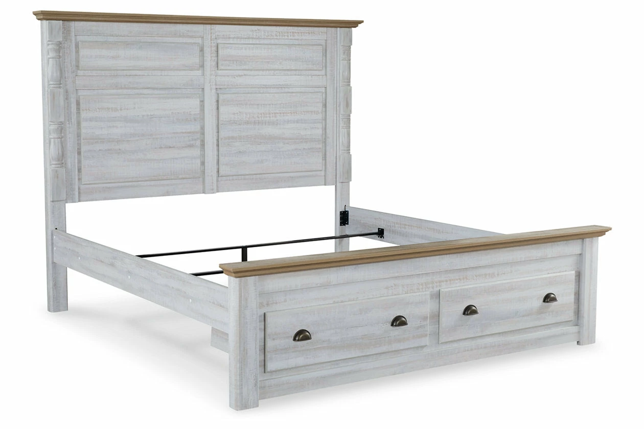 Beautifully simple yet rich with character, this queen panel bed with storage is a dream come true. It masters the art of simplicity with charming two-tone style. The gently weathered white finish is complemented by replicated oak grain on the headboard and footboard. Crown moulding and decorative turned posts add appeal. Two drawers accented by dark bronze-tone hardware let you store bed linens and blankets right in the footboard, If farmhouse style is calling your name, answer with this timeless treasure.