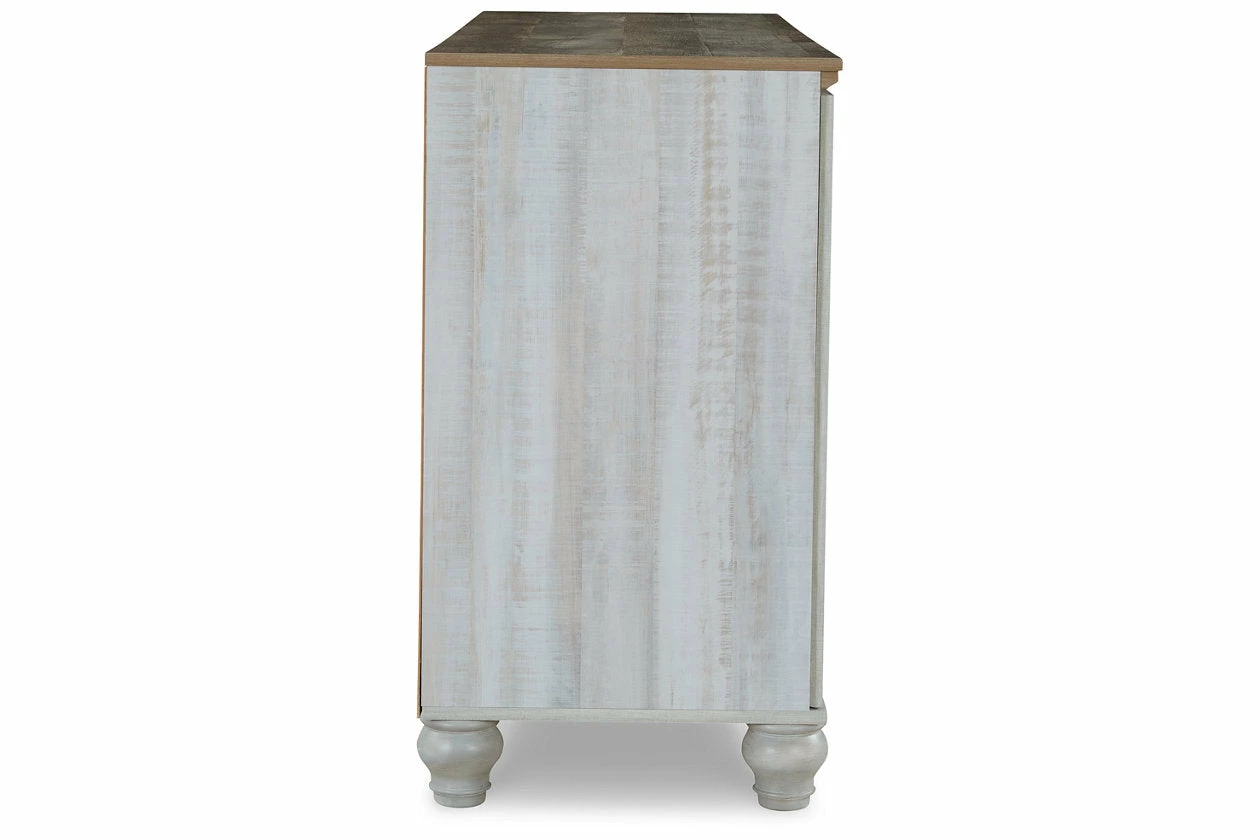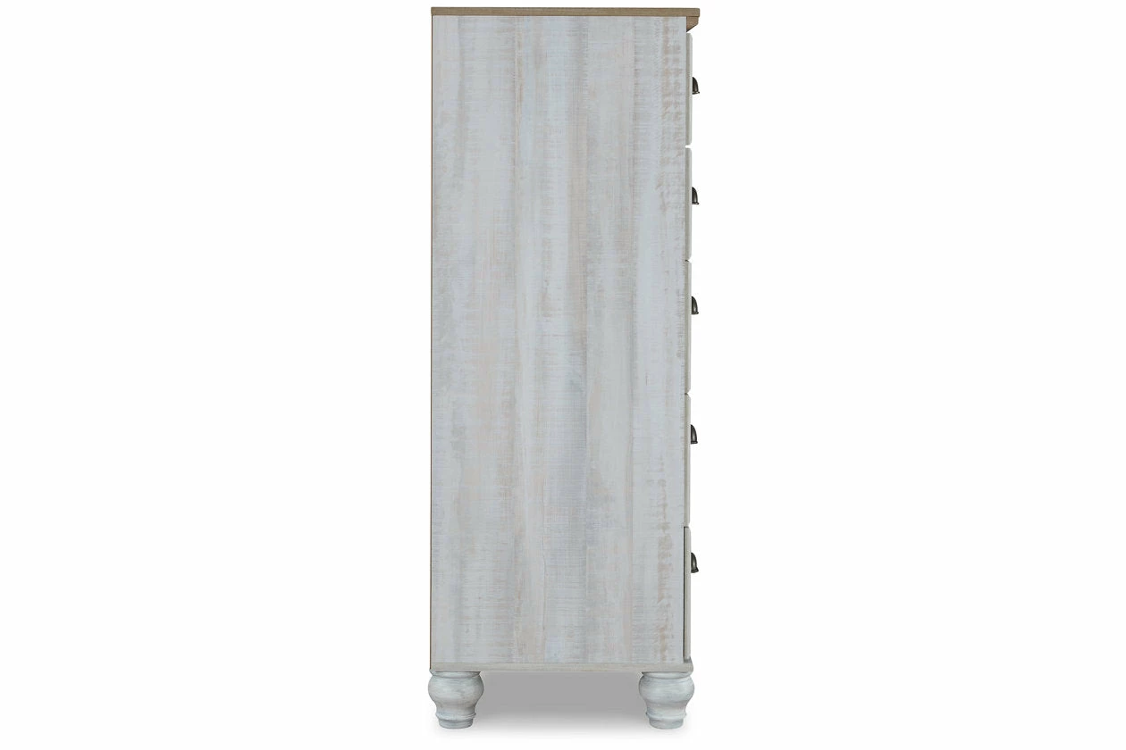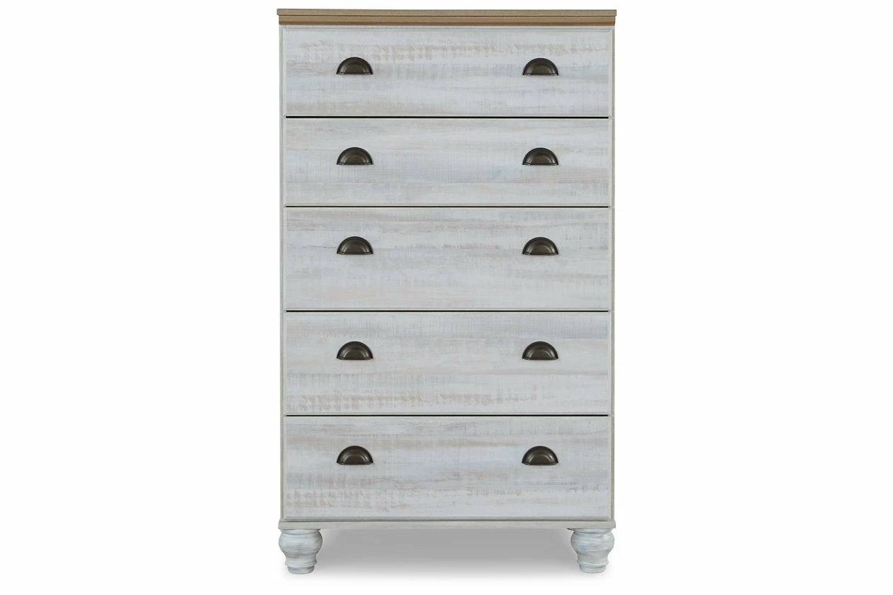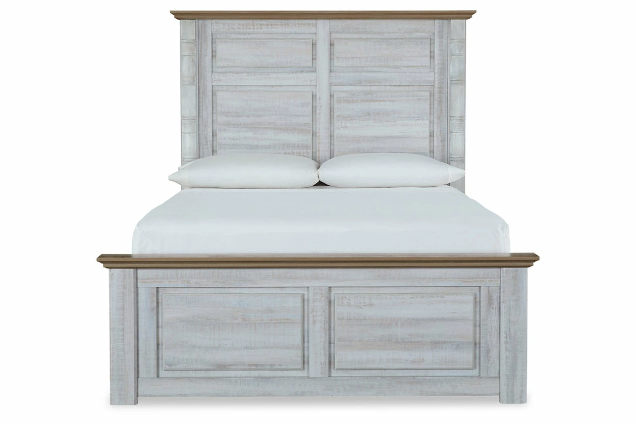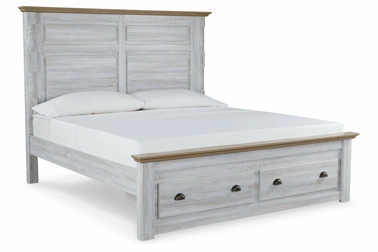 Beautifully simple yet rich with character, this queen panel bed with storage is a dream come true. It masters the art of simplicity with charming two-tone style. The gently weathered white finish is complemented by replicated oak grain on the headboard and footboard. Crown moulding and decorative turned posts add appeal. Two drawers accented by dark bronze-tone hardware let you store bed linens and blankets right in the footboard, If farmhouse style is calling your name, answer with this timeless treasure.