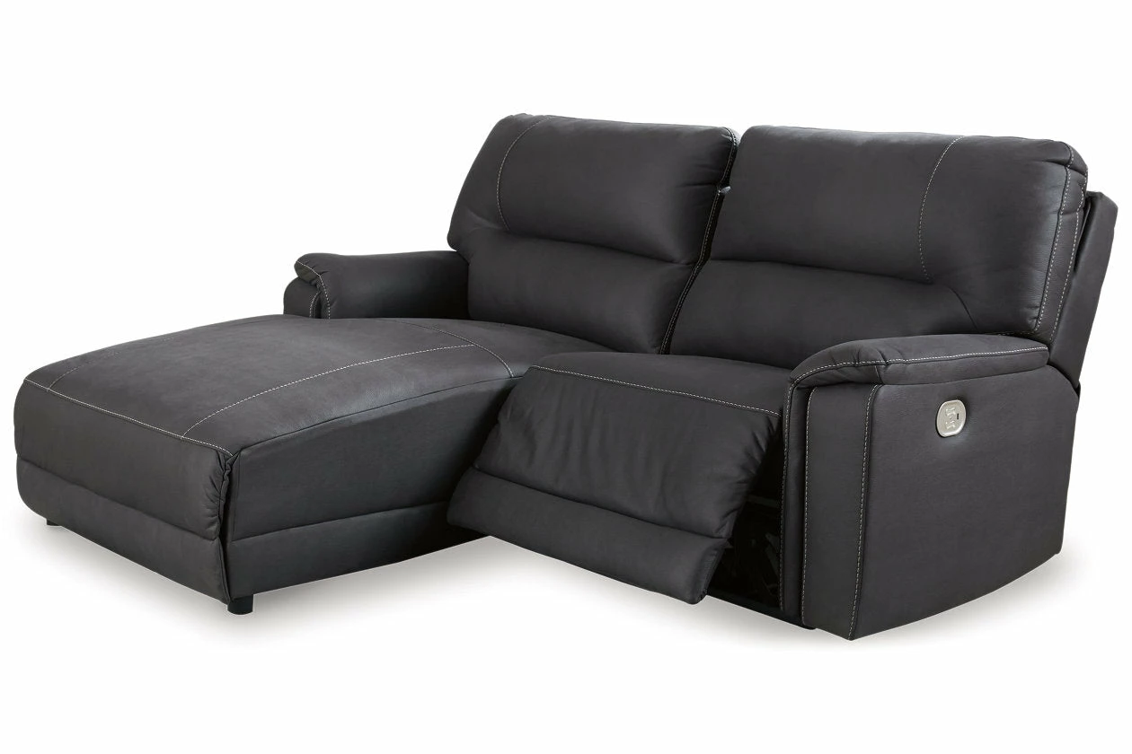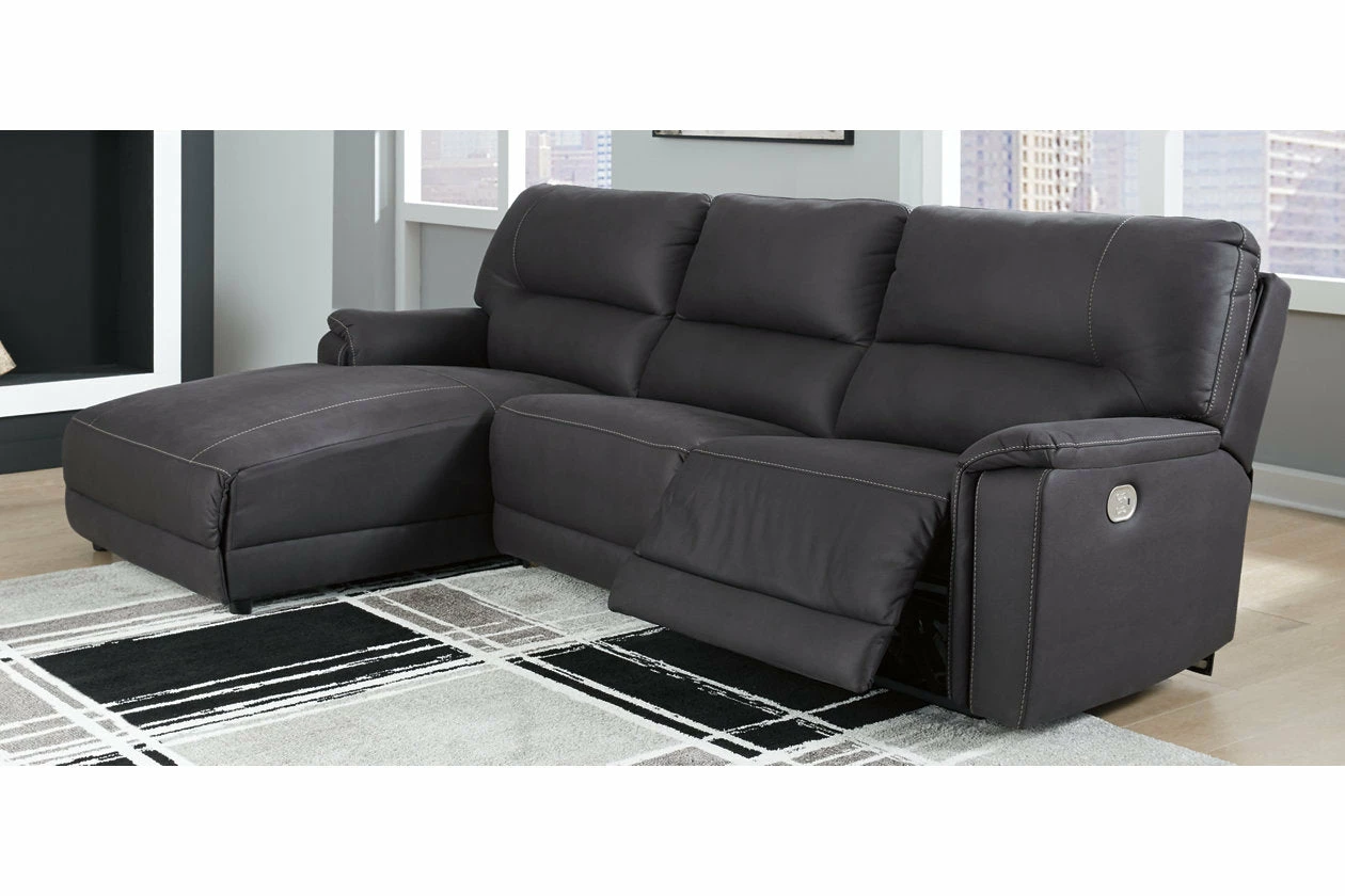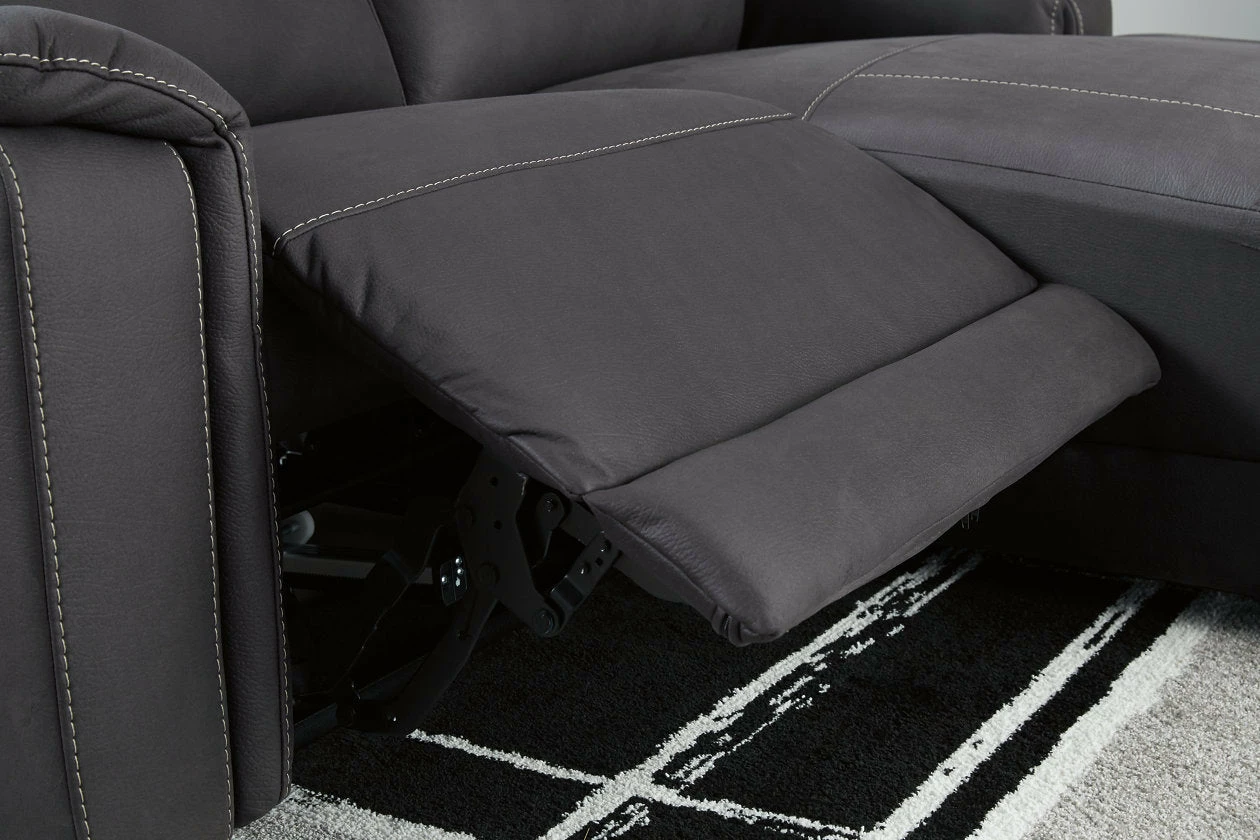 Wowing in a deep and dramatic shade of midnight gray, this power reclining sectional reflects a clean-lined approach whose time has come. Offering the cool look of leather, but with a warm and cozy feel, this ultra-contemporary sectional includes a zero wall power recliner with an Easy View™ power headrest that lets you fully recline and still have a primo view of the TV. Factor in an ergonomic press back chaise and an extended ottoman, and you’ve got a sectional that puts smart design in how you recline.
