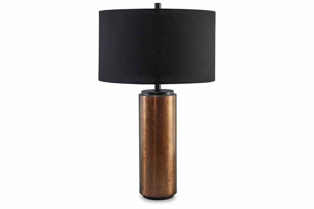 Leaning toward a unique contemporary look? This fashion-forward table lamp is pure delight. Its smooth cylindrical shape and antiqued brass-tone finish create a bold aesthetic. An instant focal point, designers love the soft light diffused by its elegant shade.