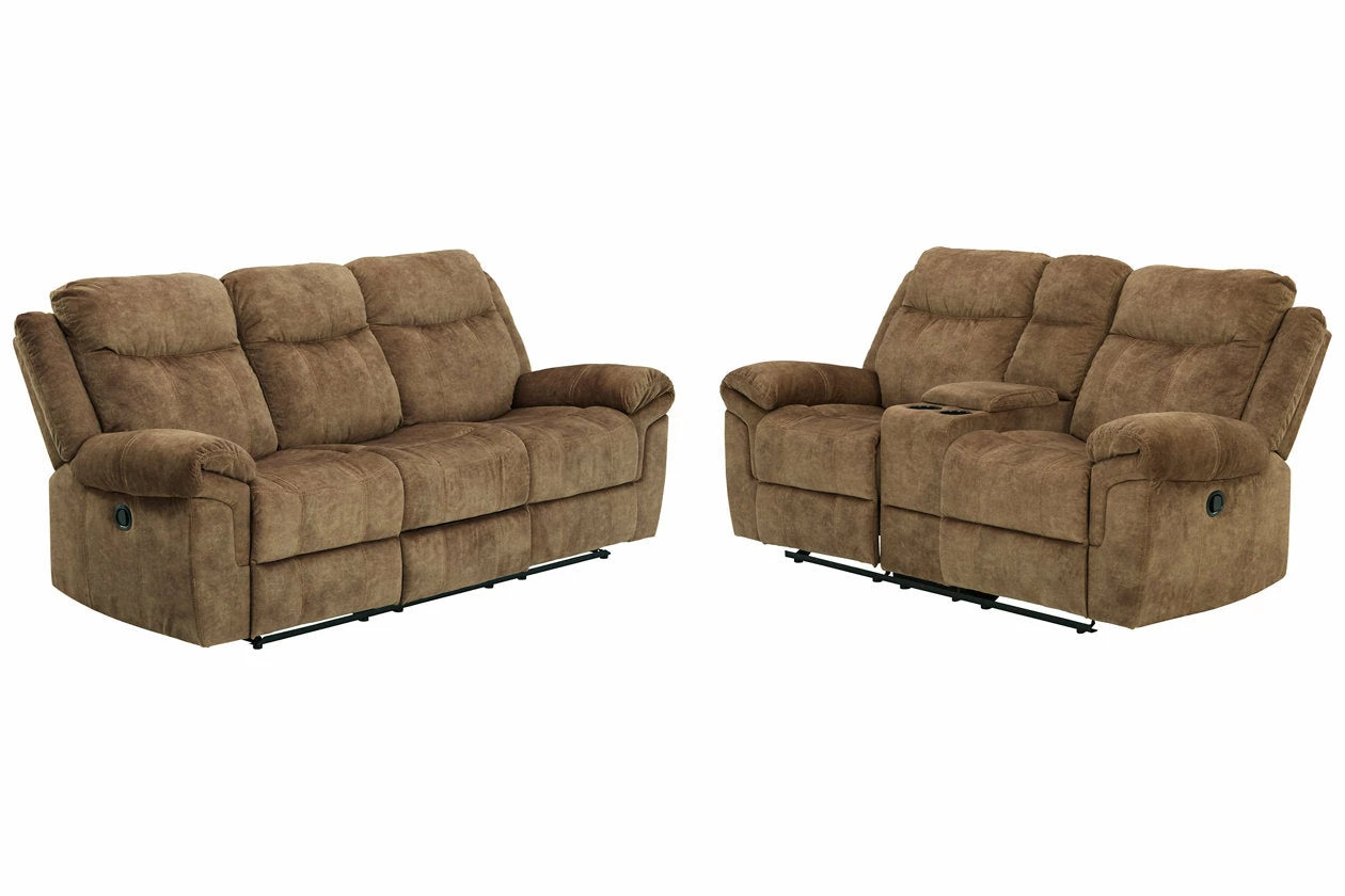 How can you not cuddle up in this decadently plush reclining living room set. Spicing things up in a warm and earthy nutmeg brown, this richly styled reclining furniture set is covered in a heavyweight padded velvet upholstery for a sense of luxury. Distinctive elements include wraparound padded armrests for a cool twist, along with a few hidden surprises. Pull the sofa’s center back cushion forward to reveal a drop-down table with dual cup holders and AC power and USB ports. A roomy storage drawer under the sofa’s center seat along with a loveseat storage console make every inch of space count.